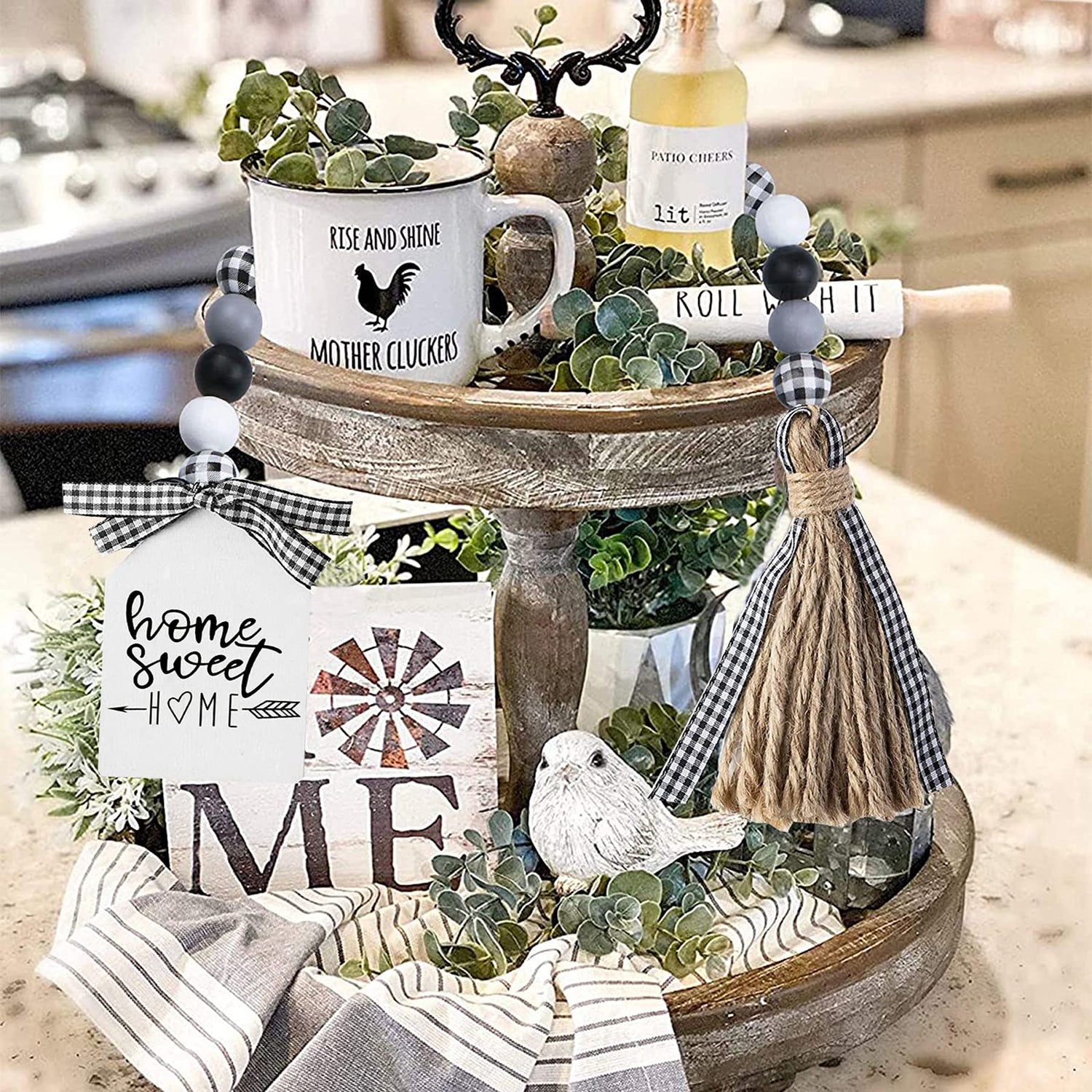 Farmhouse Plaid Wood Bead Garland with Tassel 40inch Hanging Decor Home Decorative Home Sign for Farmhouse Tiered Tray Wreath
