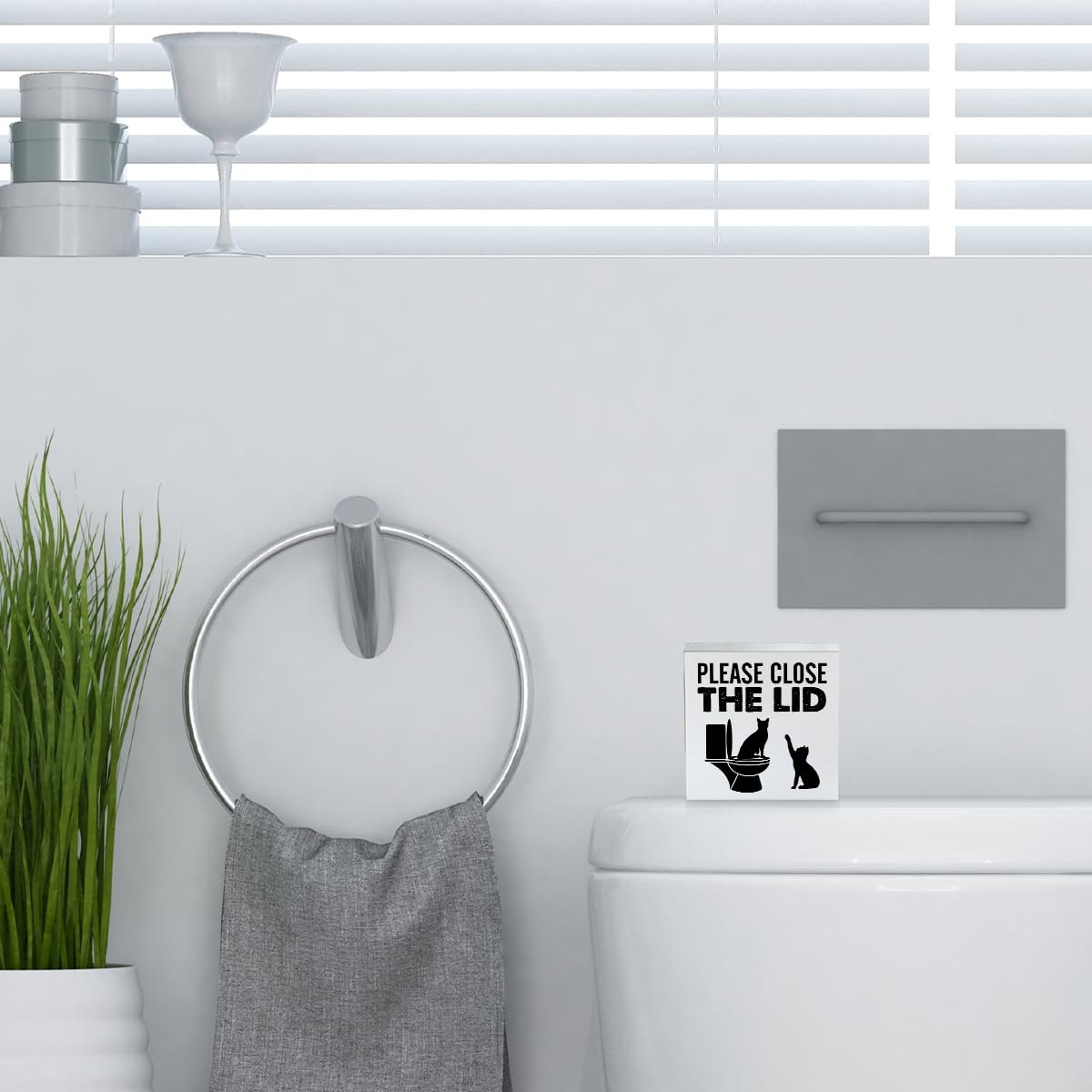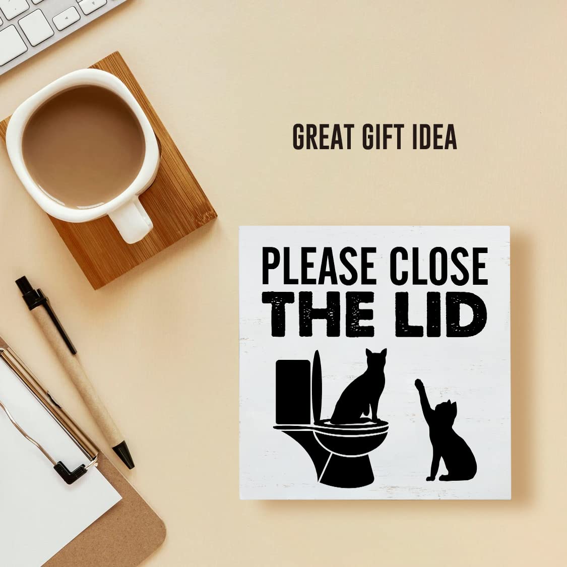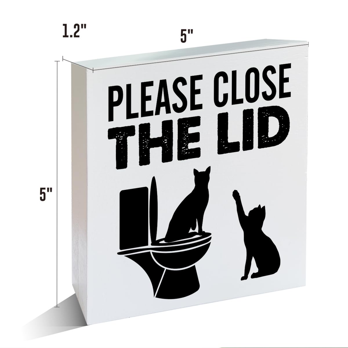 Farmhouse Please Close the Lid Wooden Box Sign Cat Bathroom Wood Block Tabletop Sign Decorative Desk Sign Home Toilet Shelf Decor 5 X 5 Inches