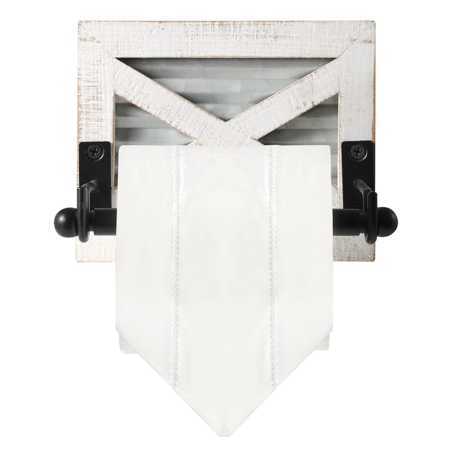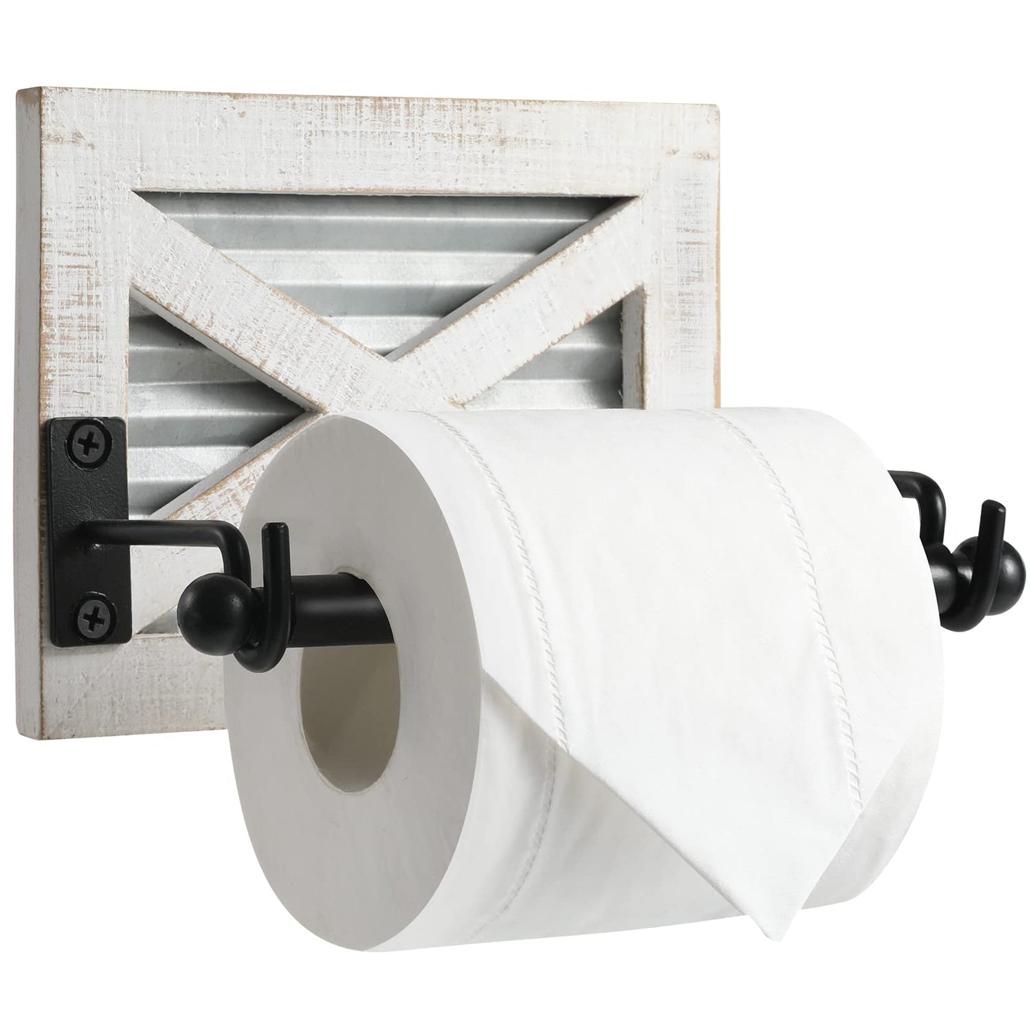 Farmhouse Toilet Paper Holder with Galvanized Metal& Black Metal - Rustic Weathered White Wood Wall Mount Toilet Roll Holder for Bathroom Decor