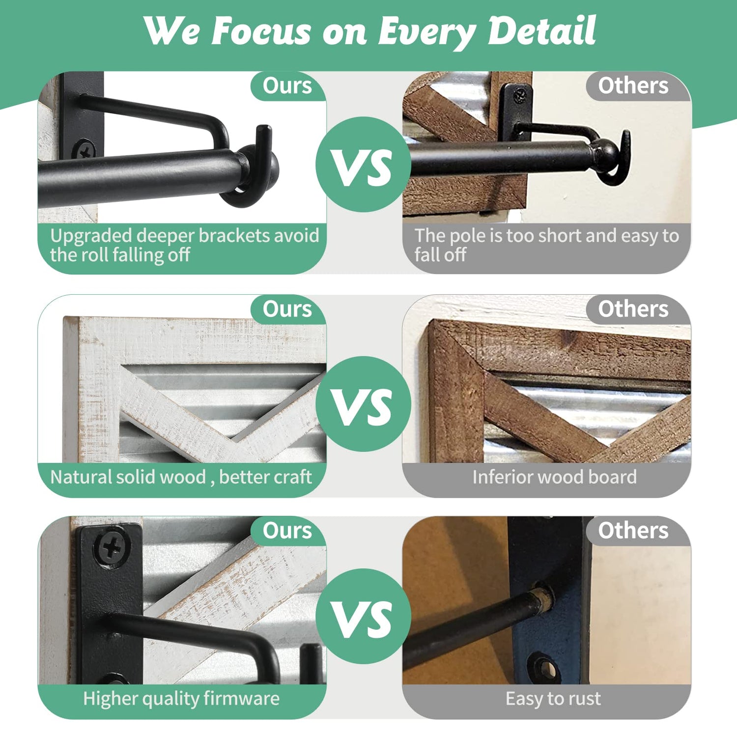 - ✨HIGH QUALITY MATERIAL: Our paper towel holder is made of high quality wood and metal material, which is strong and durable and will last for a long time. The toilet paper holder can perfectly fix the toilet paper roll without sliding freely, bringing convenience to your life.