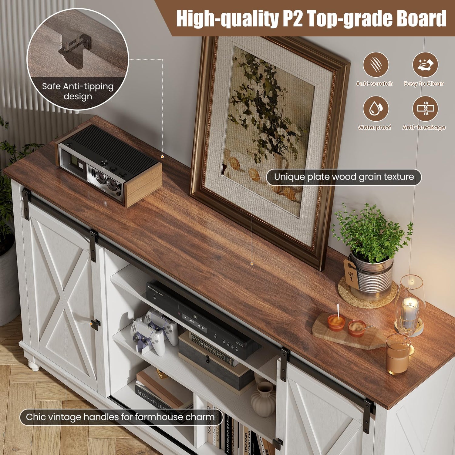 Farmhouse TV Stand for 65 75 Inch TV, 32" Tall Entertainment Center with Storage Cabinets and Barn Door, White Console Table with 3 Open storage shelve, Wood TV Console Table for Living Room, Bedroom