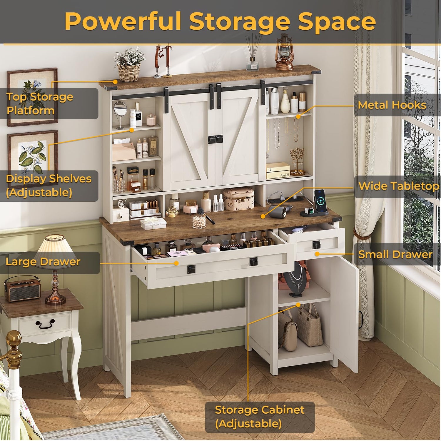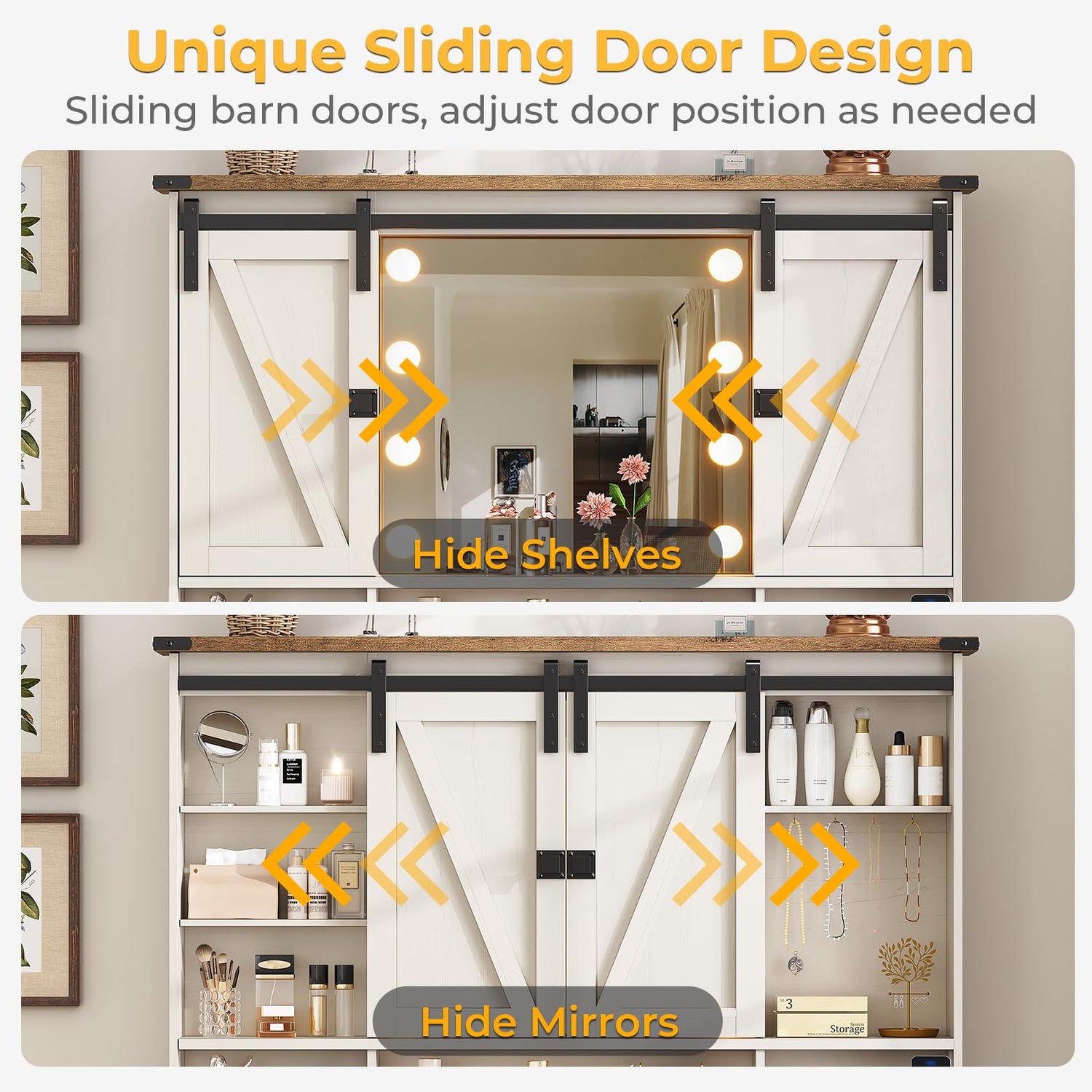 - [Farmhouse Style] This vanity desk stands out because of its rich farmhouse style. With a perfect blend of distressed white finishes, z-brace barn door trim, and exposed metal hardware, the makeup vanity desk is not only robust and sturdy, but it also has farmhouse charm and adds a relaxed, earthy aesthetic to the room. The unique sliding door design on the upper part can be used to hide the shelves/lighted mirror, both exquisite and practical