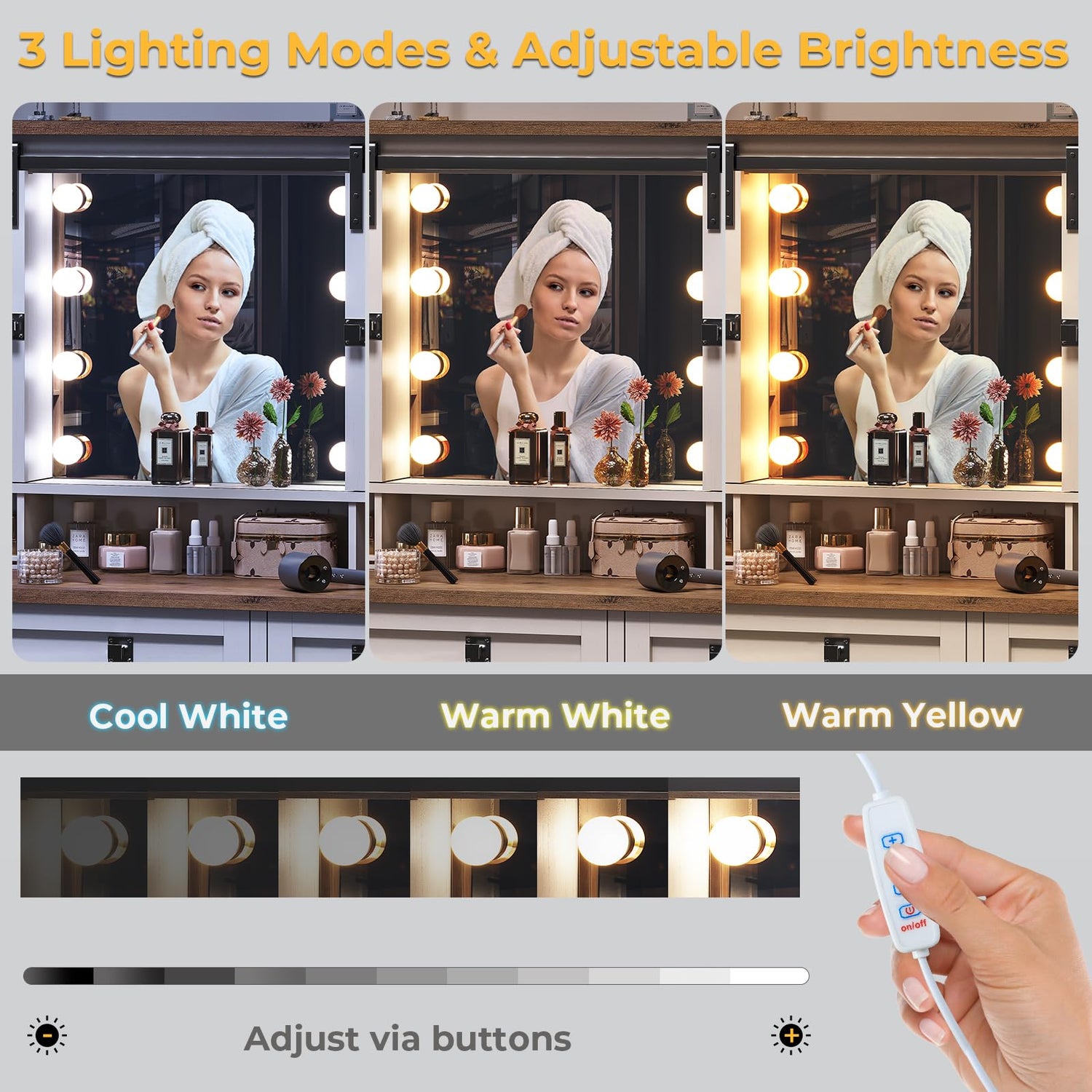 - [3-Color Adjustable Hollywood Bulbs] The 18.6''W x 18.9''H mirror comes with 8 Light Bulbs, providing clearer lighting during skin care/makeup. It has 3 adjustable color modes (warm yellow, warm white, cool white), suitable for creating exclusive makeup looks for different occasions. The brightness of each color is also adjustable through the control button. Light up your stage and shine like a star