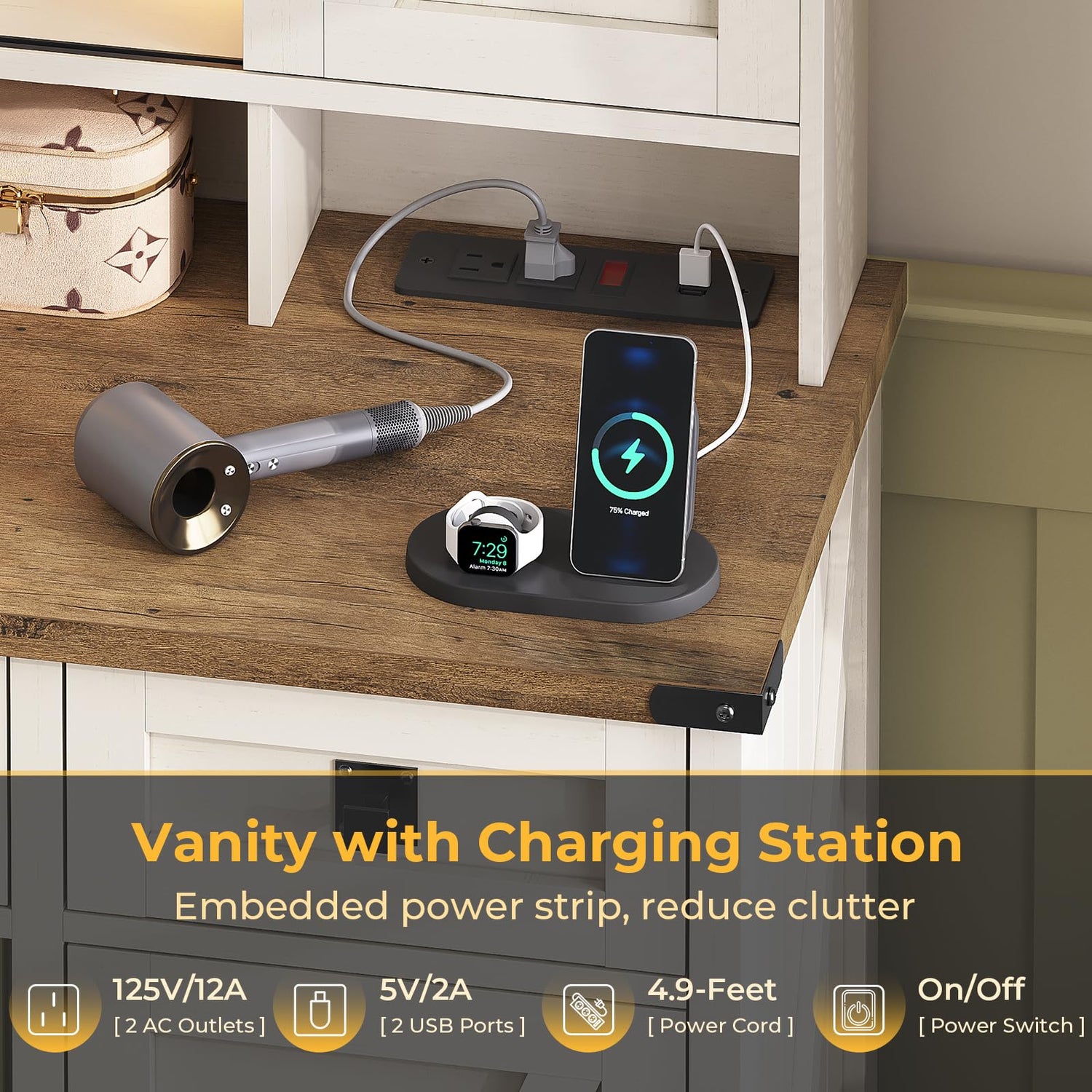 - [Makeup Table With Charging Station] Equipped with a charging station, including 2 standard plug sockets and 2 USB ports, which is more convenient for connecting hair dryers, curling irons, etc., and can also charge your mobile phone/tablet/smartwatch. Everything can be done on this vanity table
