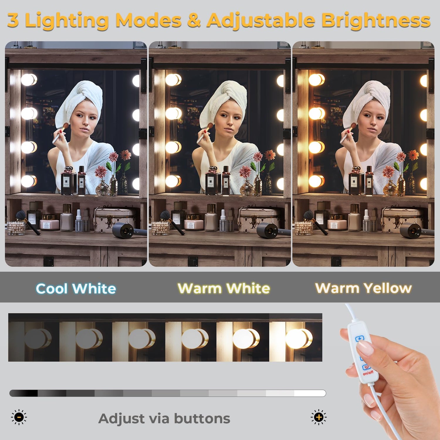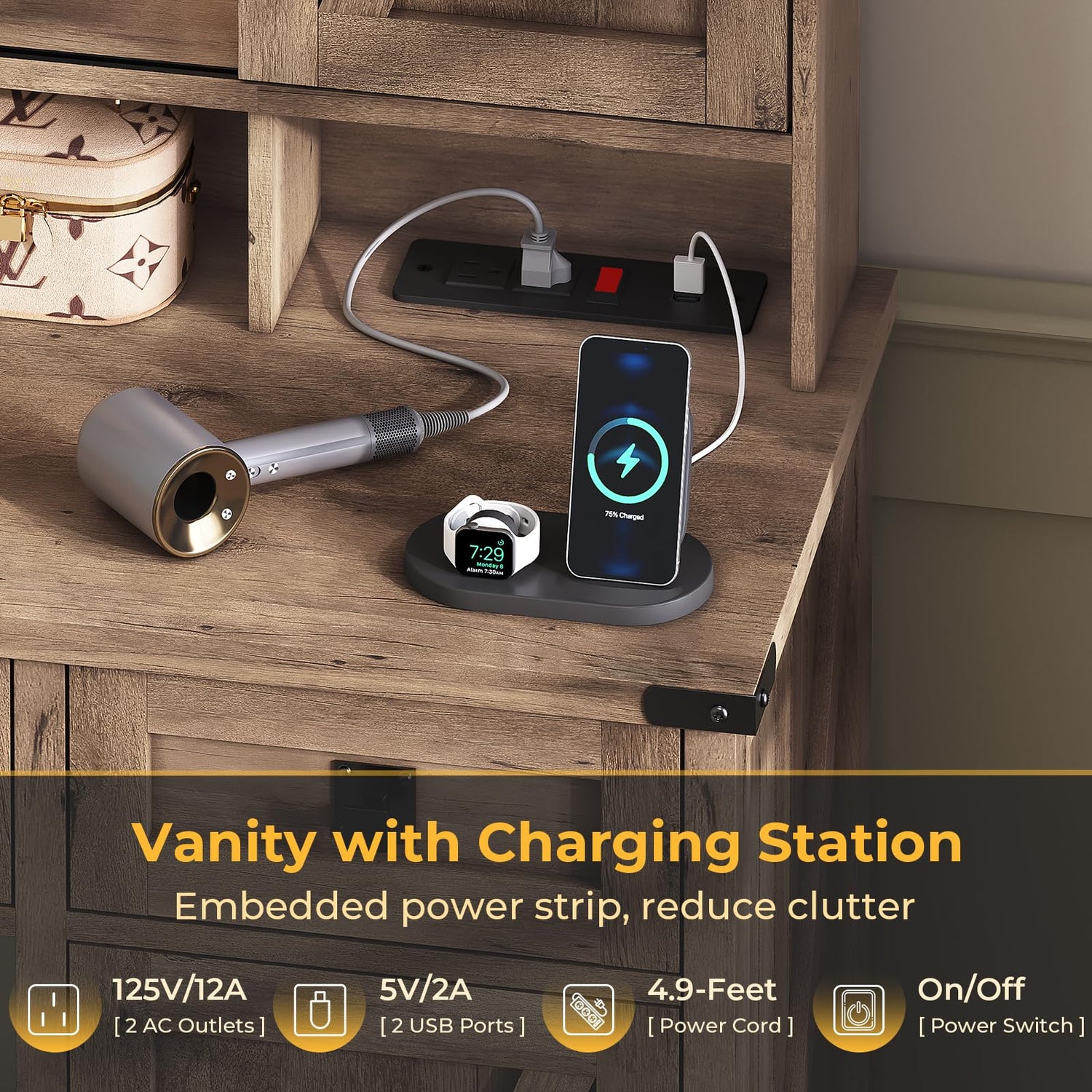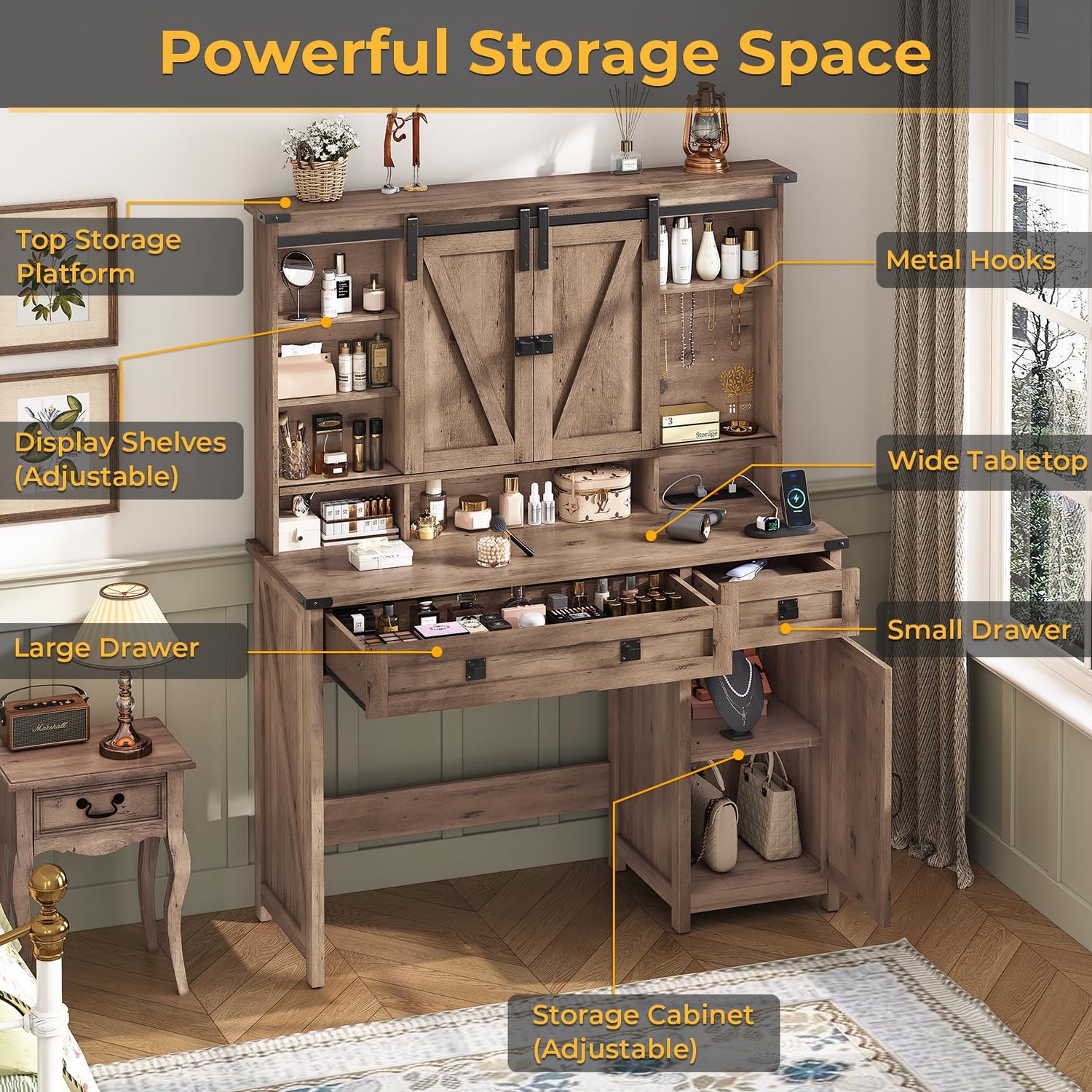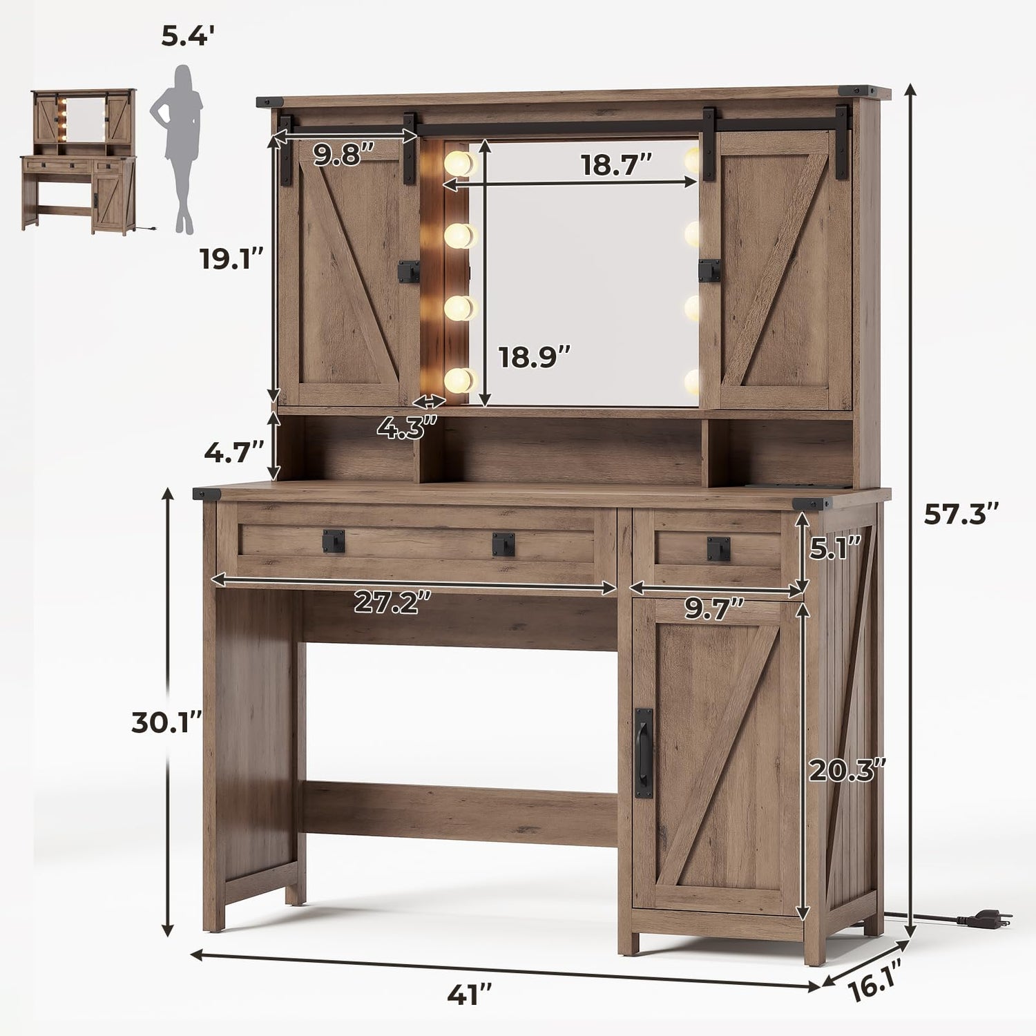 Farmhouse Vanity Desk with Mirror and Lights, 41" Sliding Door Makeup Vanity with Charging Station, Large Vanity Table with Drawers/Shelves/Cabinet Storage, Rustic Oak