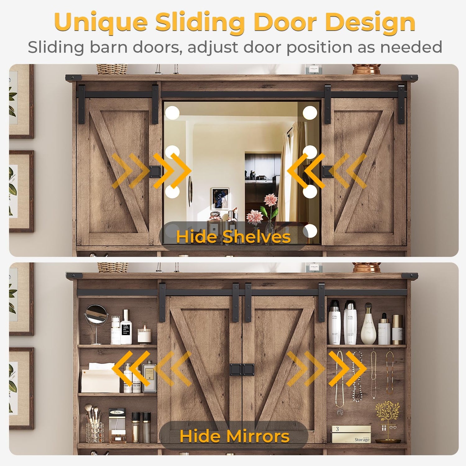 - [Farmhouse Style] This vanity desk stands out because of its rich farmhouse style. With a perfect blend of distressed white finishes, z-brace barn door trim, and exposed metal hardware, the makeup vanity desk is not only robust and sturdy, but it also has farmhouse charm and adds a relaxed, earthy aesthetic to the room. The unique sliding door design on the upper part can be used to hide the shelves/lighted mirror, both exquisite and practical