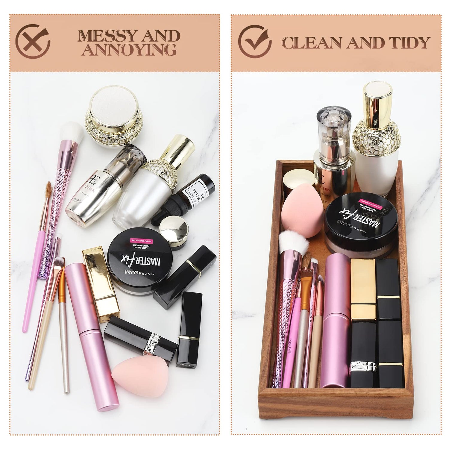 - SAVE SPACE: A wooden tray brings order and elegance anywhere in your lovely home. Set it on the toilet tank top, dresser, vanity, end table, kitchen, nightstand or desk in your house, to cut the countertop clutter, keep all your favorite items organized and within easy reach.