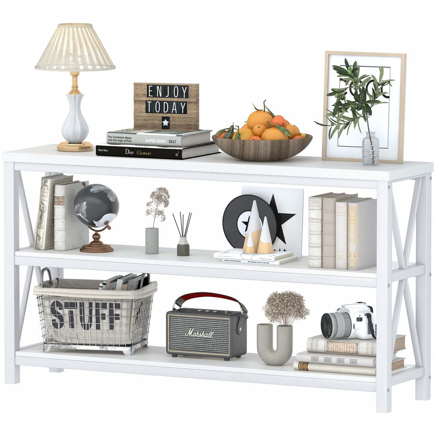 - [Structure Highlights & High Weight Capacity]: Thanks to the premium material and sturdy & stable structure, this console table stands very stable behind couch. Chunky table top (1.18’’ thickness) and 2 pcs support tube under each shelf increase the weight capacity a lot. Table top can easily hold up to 240lbs stuff and 2 lower shelf can easily hold up to 160 lbs stuff