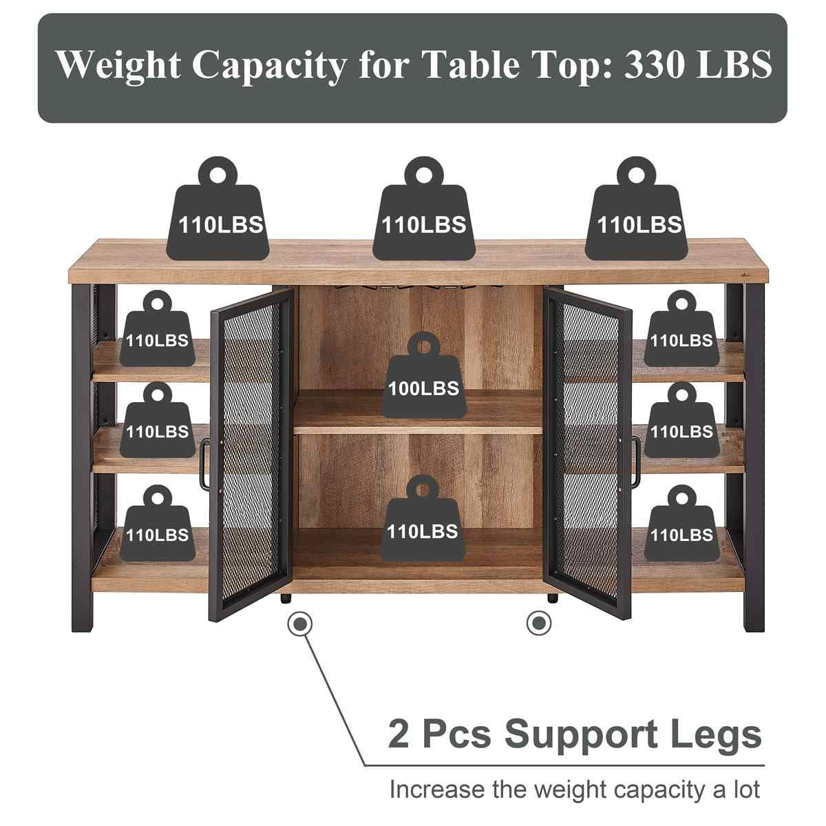 - [100% NOT WOBBLE & High Weight Capacity]: Thanks to the high-grade material and well structured design, this liquor cabinet stands very strong. Adding 2 pcs support leg under bottom shelf enhance the weight capacity and stability a lot. The tabletop can easily hold up to 330 lbs and each shelf hold up to 110 lbs.