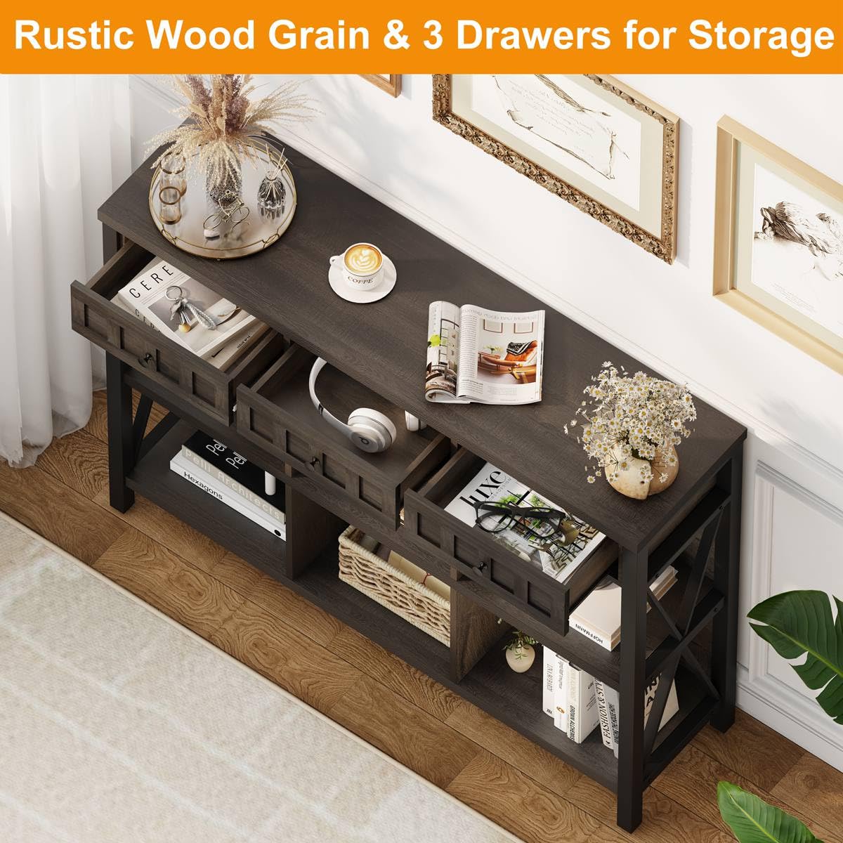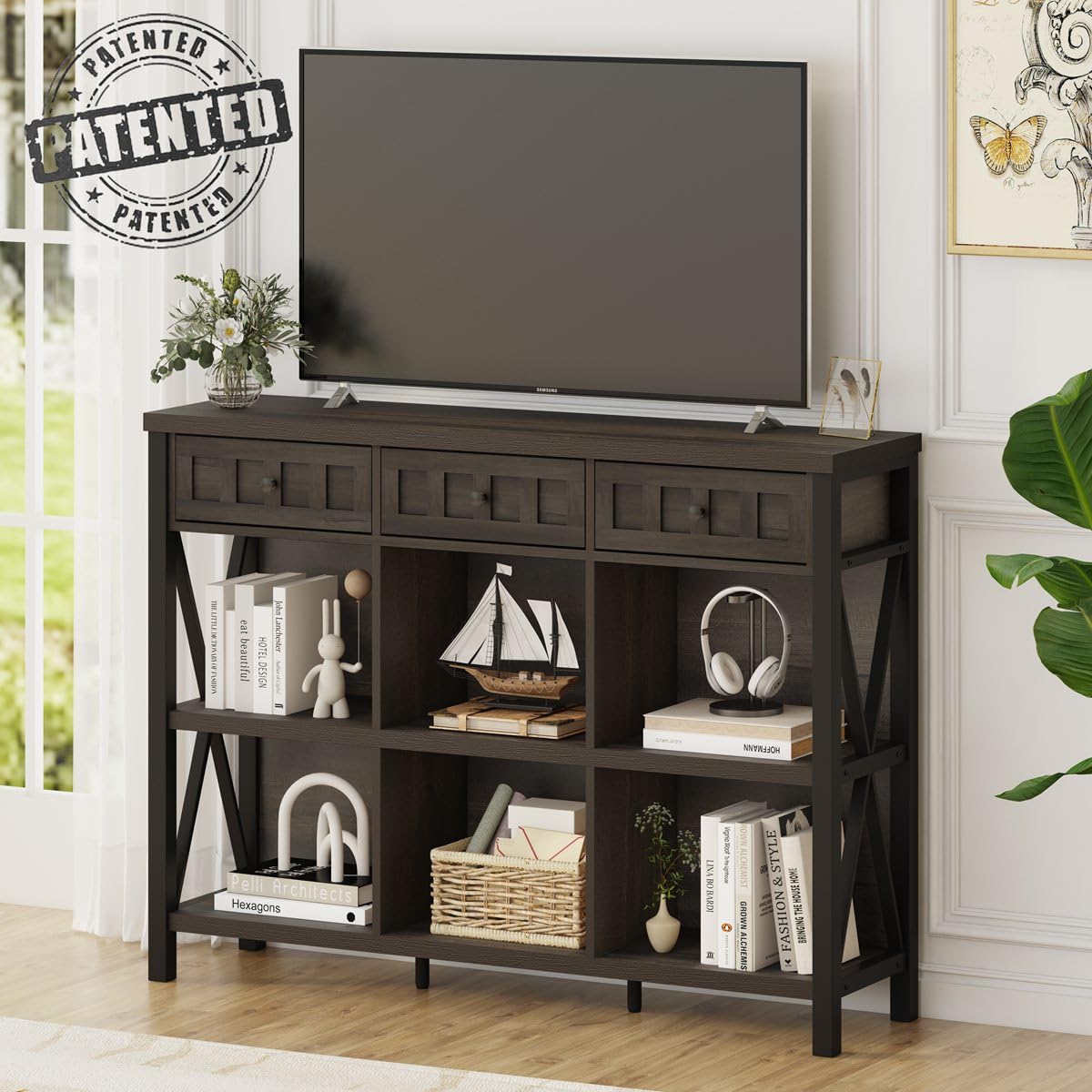 FATORRI Rustic 6 Cube Storage Organizer Bookshelf with 3 Drawers, Short Low Horizontal Bookshelf for Living Room, Industrial Wood and Metal Cubby Bookcase for Home Office (Walnut Brown, 47 Inch)