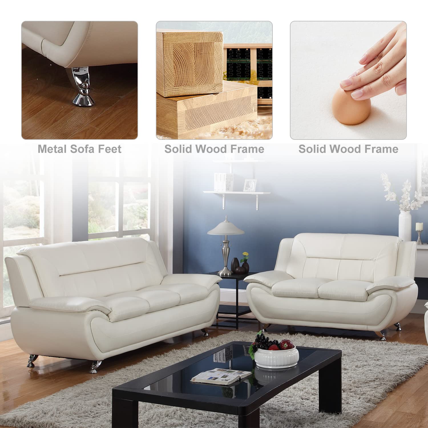 Faux Leather Sofa Couch Set, Living Room Sofa and Loveseat Set, Leather Couch and Loveseat Set for Living Room Office Home (2 Piece Leather Living Room Set, Cream White)