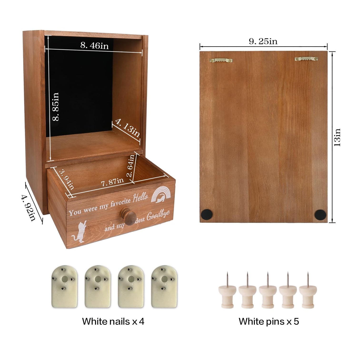 - Wall-mounted Easy Hanging: The cat keepsake box is super easy to install, all you need is to measure length between the two hooks, install the nails with a hammer, then hang the pet shadow box on. There are 4 nails and 5 pins in the package, don't worry about lack of accessories. Vintage look would match any home décor