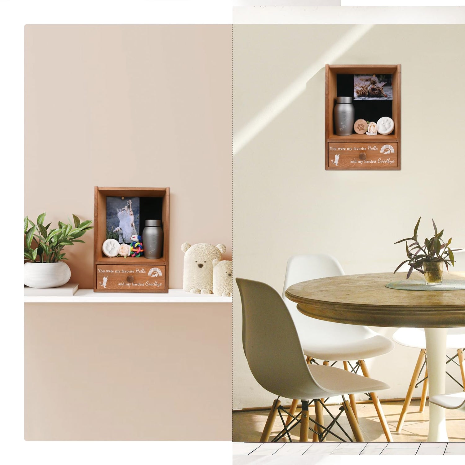 - Shadow Box with Large Space: The pet memorial shadow keepsake box is 9.25" x 13", deep enough to store all the memory of your beloved cat, such as his/her photos, paw print, collar, leash, ID tag, birth certificate, toys, balls and urn. There's also a 7.8" x 3.9" drawer for keeping their little items and ashes
