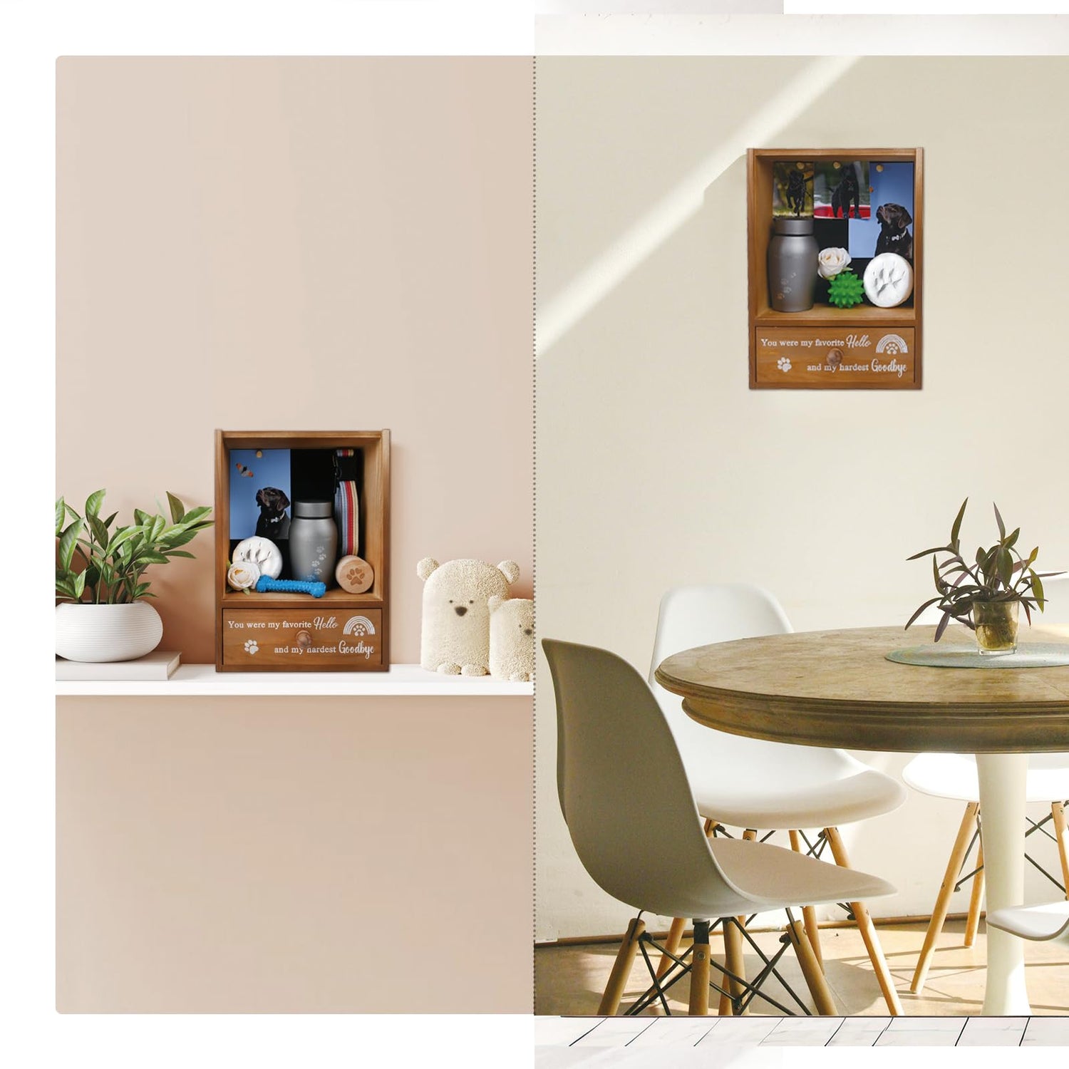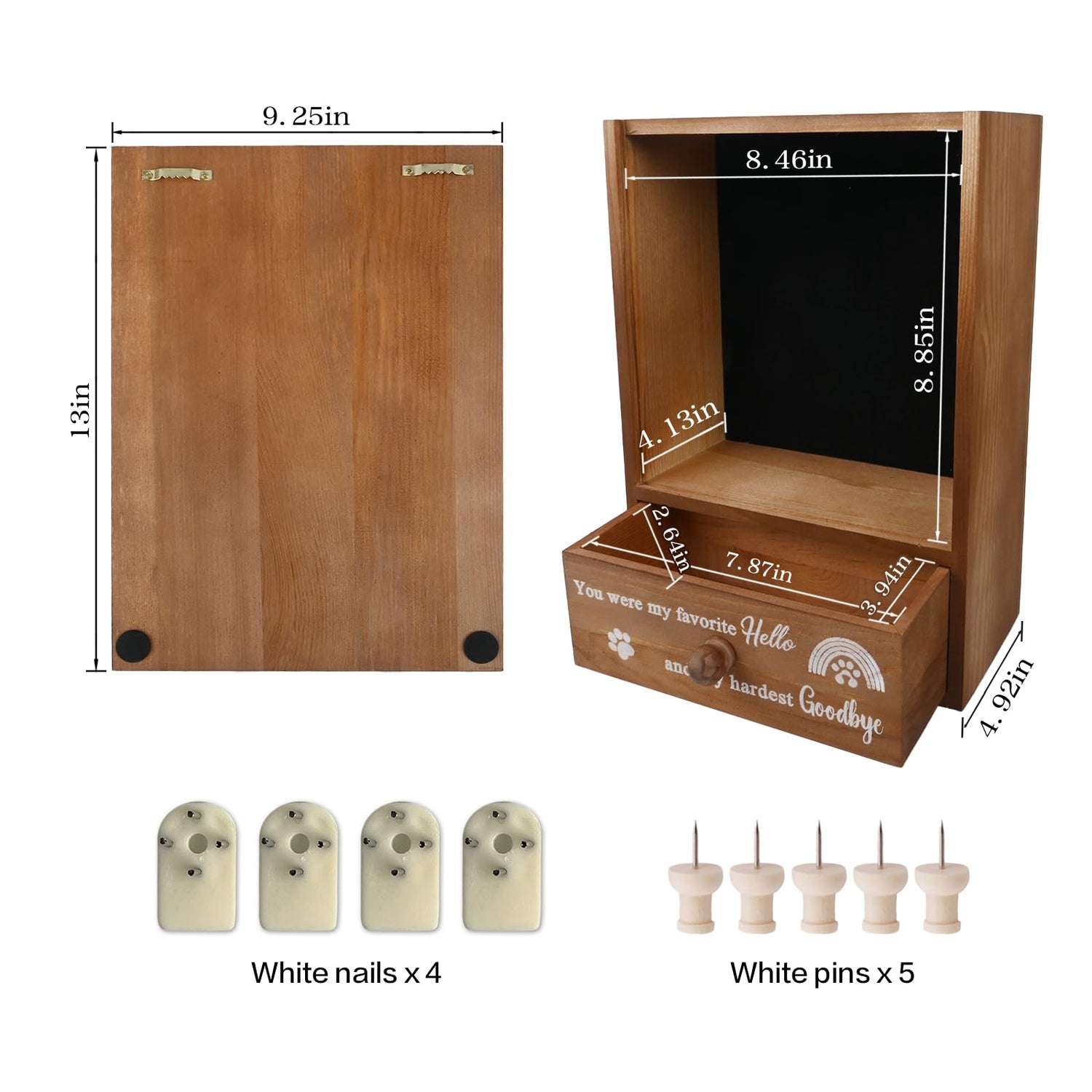 - Wall-mounted Easy Hanging: The dog keepsake box is super easy to install, all you need is to measure length between the two hooks, install the nails with a hammer, then hang the pet shadow box on. There are 4 nails and 5 pins in the package, don't worry about lack of accessories. Vintage look would match any home décor