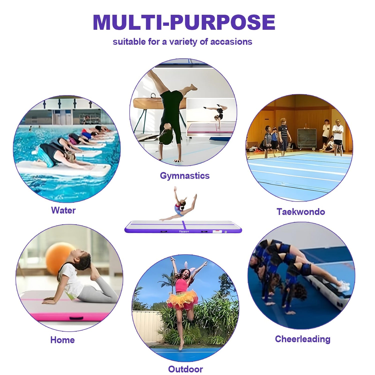 - WIDE APPLICATION: you can place the gymnastics mat, air training mats, inflatable gymnastics mat, air gymnastics mat on the artistic gymnastics floor, the gym floor, in high-performance training, fitness clubs, dance clubs, schools, gymnastic exercises, home entertainment, leisure centers, gymnasium, professional training, park or rental business. Also, it could be used on beach or water, backyard, grass land, for Cheerleading/Practice Gymnastics/Beach/Park/Home use.