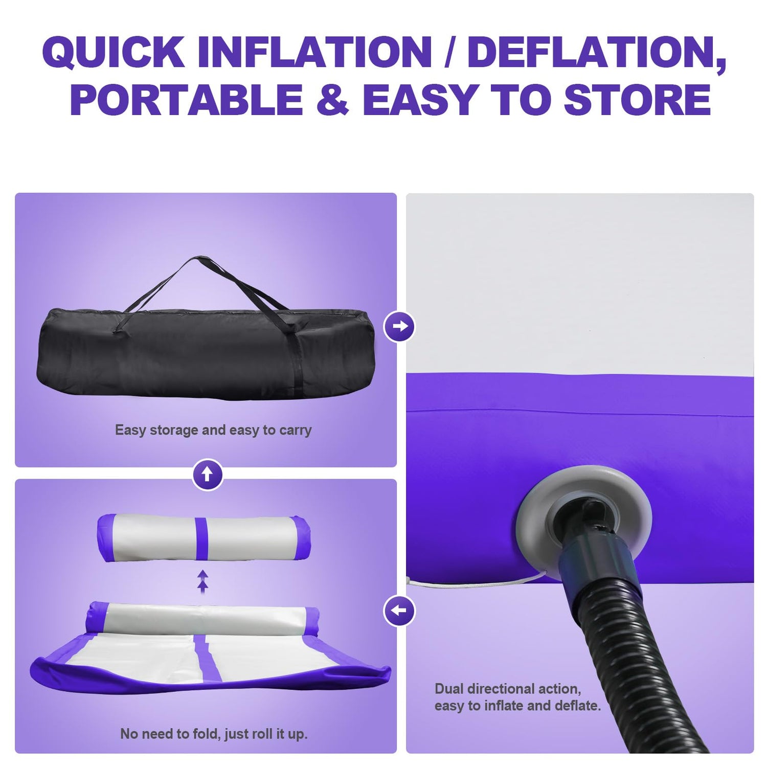 - FAST INFLATION: You will receive an Electric Air Pump. Only take less than 1 minutes to inflate or deflate the air gymnastics mat. No noise during training. After inflation, the inflatable gymnastics mat will maintain its pressure for days.