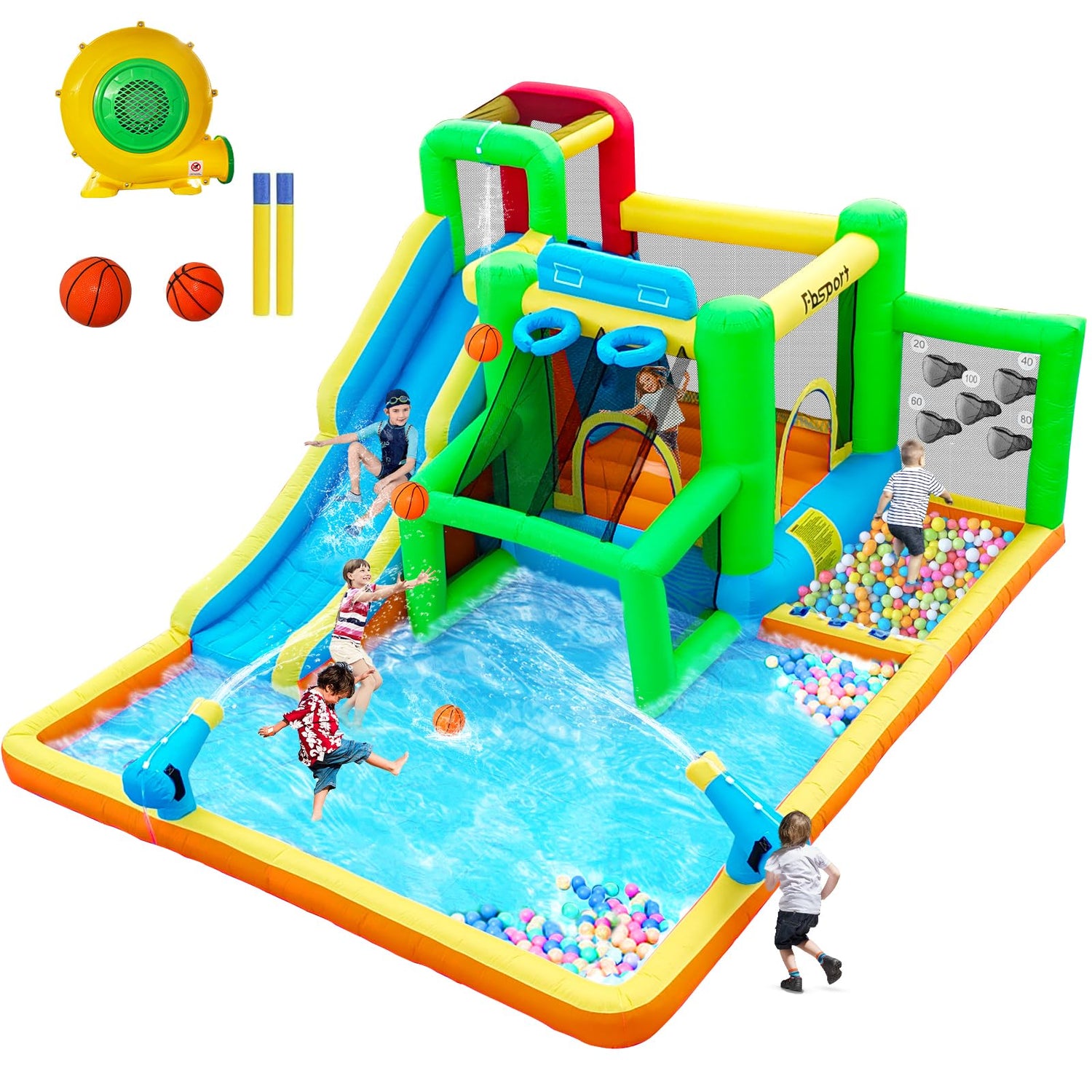 - 【9-in-1 Combo of Multiple Games】The 10-in-1 bouncy castle is including bounce house jumping area, water slide, climbing wall, ball shooting, basketball shooting, upgrade 2 water gun and big water pool with water sprayer,children can enjoy fun of various of games.In addition, the water gun and sprinkler can continuously provide cold water spray to keep the slide and splash pool wet, so that children can immerse in the cool inflatable water castle!