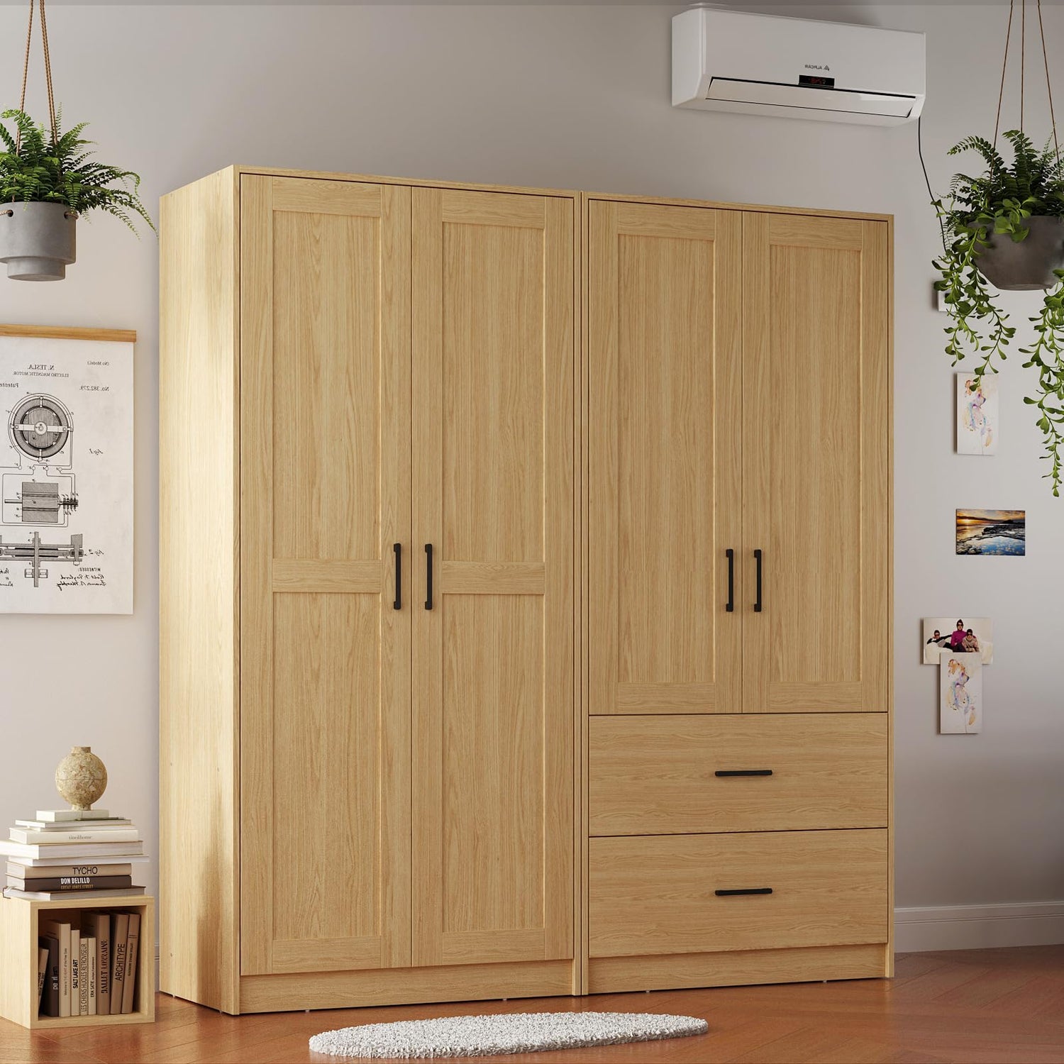 Details: Product Description ▶▶ Features: The wardrobe adopts a modern design style, effortlessly combining aesthetics with practicality, keeping the room tidy while giving it a unique aesthetic. The wardrobe adopts a double door design, which is simple and elegant, while also dust-proof, keeping clothes fresh for a long time. The interior adopts a long hanger design, with a hanging area length of 47.3 inches, suitable for storing long clothes such as suits, dresses, pants, etc., which can effectively prevent clothing wrinkles. At the same time, internal partitions have been added to improve space utilization efficiency. Bedclothes and folding clothes can be placed on the bottom and partition. ▶▶ Specifications: Available colors: wood grain/white Item type: 2 door wardrobe Overall dimensions of wardrobe: 68.9 inches high x 31.5 inches wide x 18.9 inches deep ▶▶ Packaging included: 1 wardrobe ▶▶ explain -The dimensions are manually measured and may have an error of approximately 1 inch, but this is normal -Due to monitor, camera, or other factors, there may be slight color differences. Please refer to the actual product. ▶▶ Finally There is no perfect product, but we can provide you with better after-sales service. If you encounter any problems when purchasing our products, please communicate with us via email in a timely manner. We will process it within 24 hours and make every effort to satisfy you.