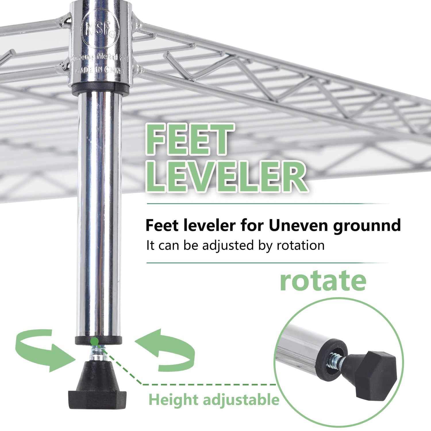 The adjustable leveling feet make wire shelving unit to be placed on uneven ground simple twist is all it takes to stabilize.