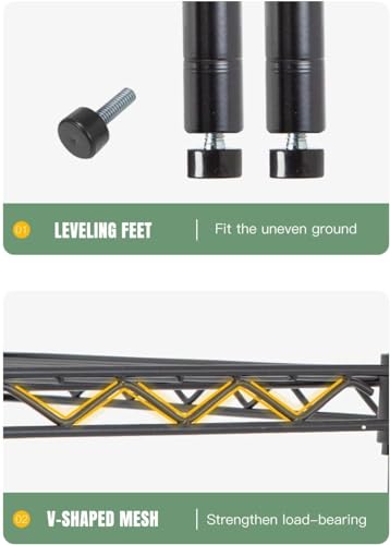 - 【ADJUSTABLE】: You can adjust the height of the commercial storage shelves according to the size of the item.The spacing of each layer of this wire shelf can be adjusted.shelves adjustable leveling feet allow the wire shelving unit to be placed on uneven ground--a simple twist is all it takes to stabilize.