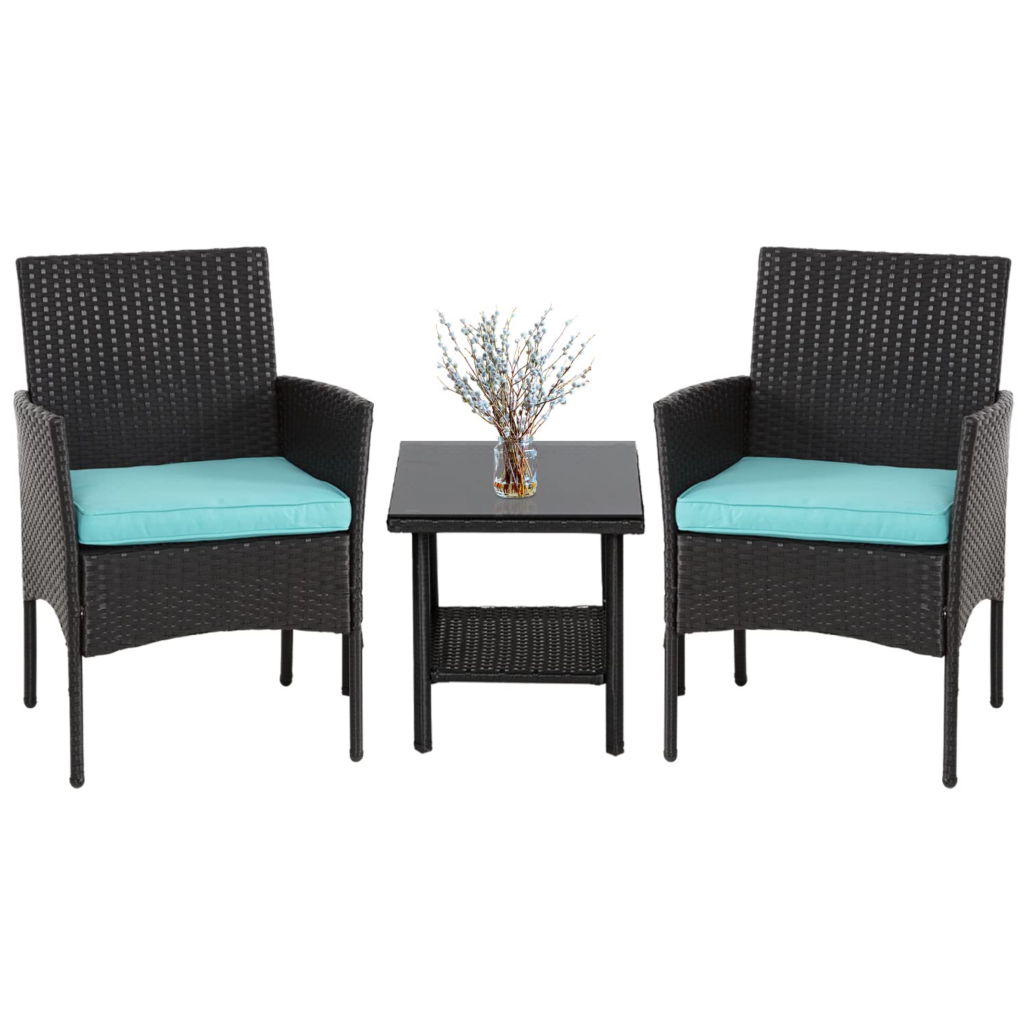 - ♬【SIMPLE & ELEGANT】-Outdoor set features and elegant glass top side table perfect for a couple glasses of wine or the morning coffee and newspaper.The patio set is simple and stylish,it will be perfect for decorating your yard, poolside, balcony, patio and home.Rattan Chair Dimension: L23" x D23" X H33,Table Dimension: L16"xW16"xH16”.
