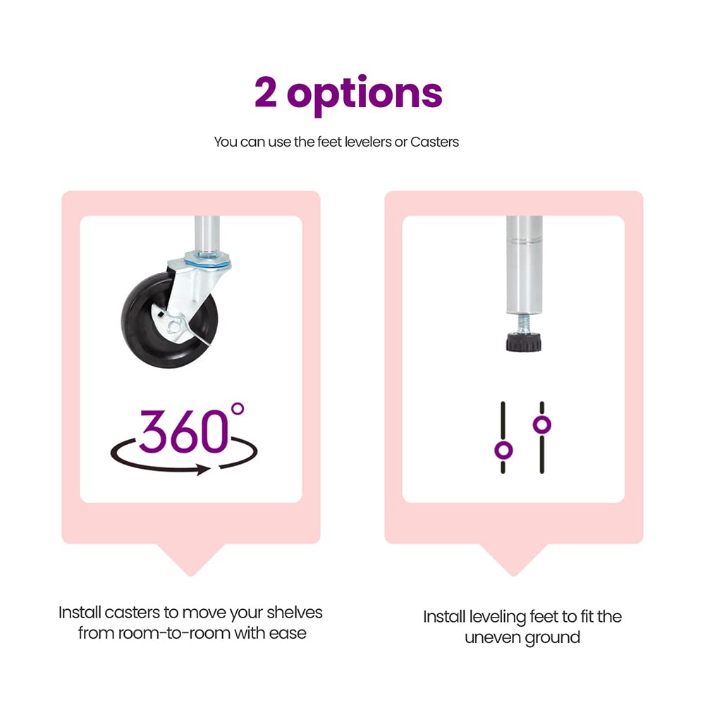 - ✔【Strong Weight Capacity】Without wheels, the weight limit for each shelf is 350 pounds and the total weight limit for the entire shelf is 2,100 pounds.When wheels are mounted, the weight limit for each shelf is 85 pounds and the total weight limit for the entire shelf is 510 pounds.