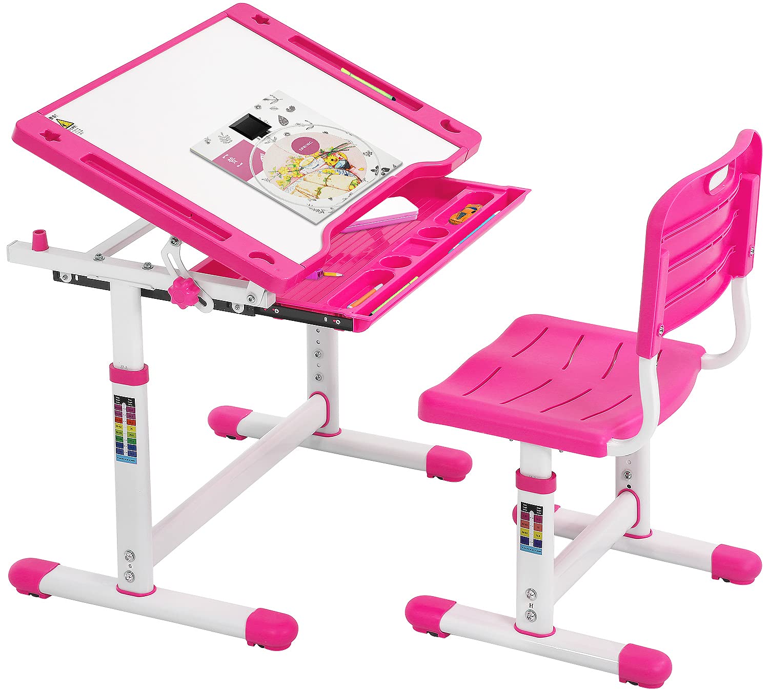 FDW Kids Desk Children Writing Student Desk Drafting Table Height Adjustable Study Table and Chair with Drawers Storage,Pink