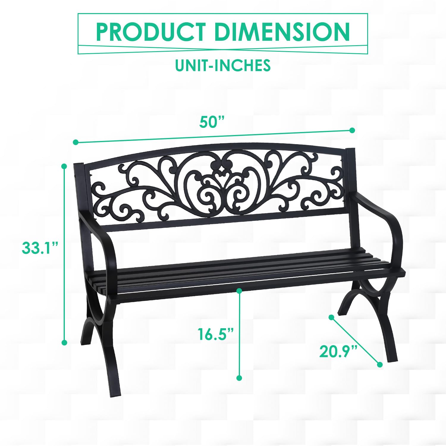 - Sturdiness: The Park Bench is made of reinforced steel to ensure sturdiness and stability, durable and the Metal Bench perfect for use for years.The Garden Bench is powder coated with rust-resistant finish, super smooth. The bench comfortably seats two adults and bears weight to 485 lbs.