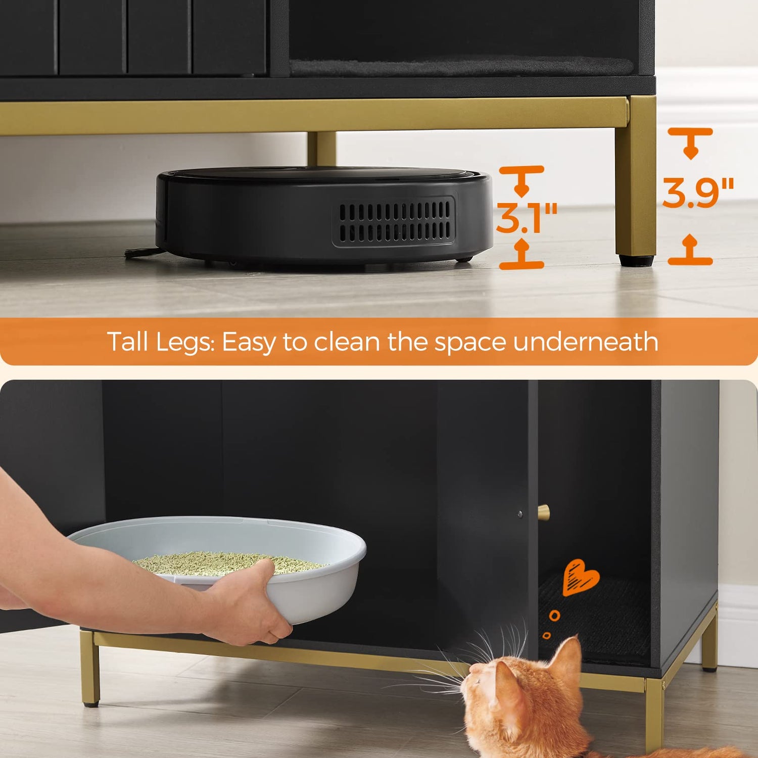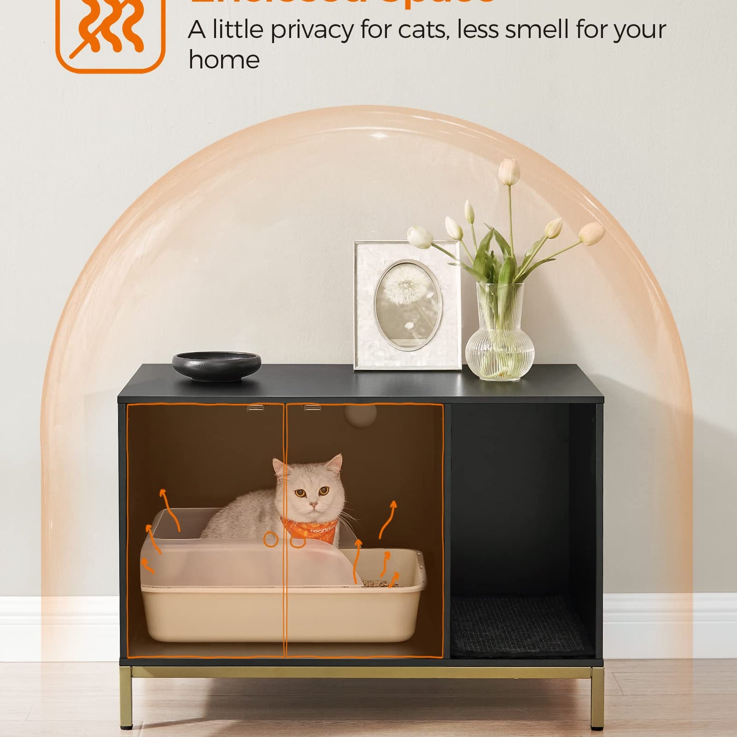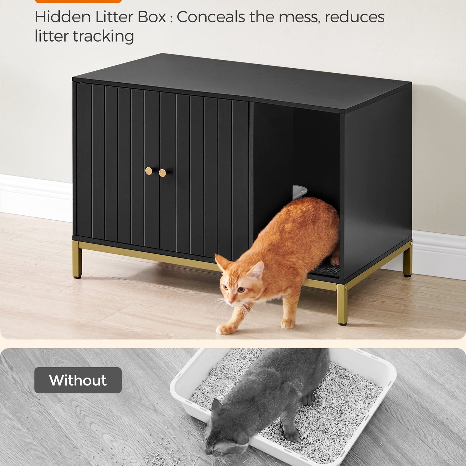 - [Style the Litter Box Area] Featuring a black finish and gold-colored metal frame, this modern litter box enclosure easily blends in with your current furniture, giving the once-messy litter box area a makeover