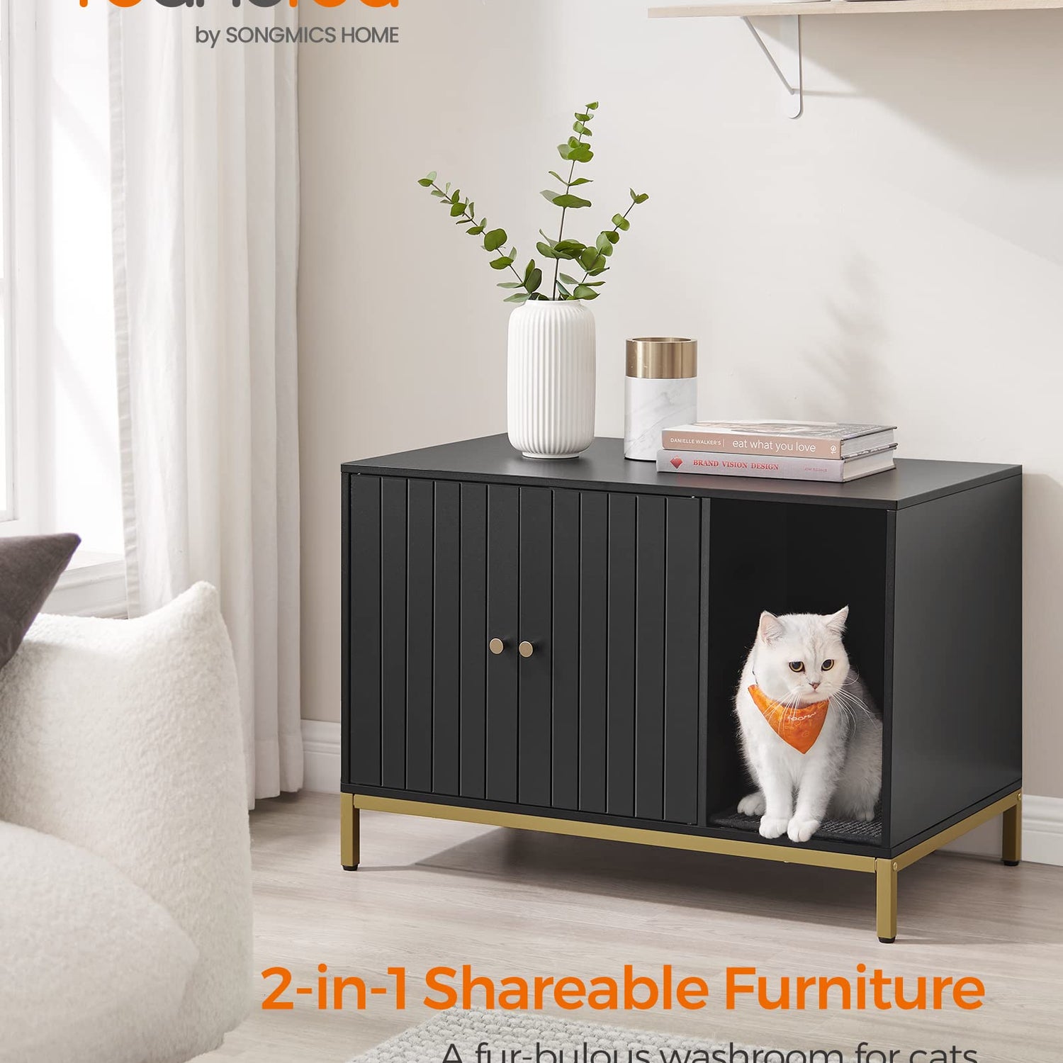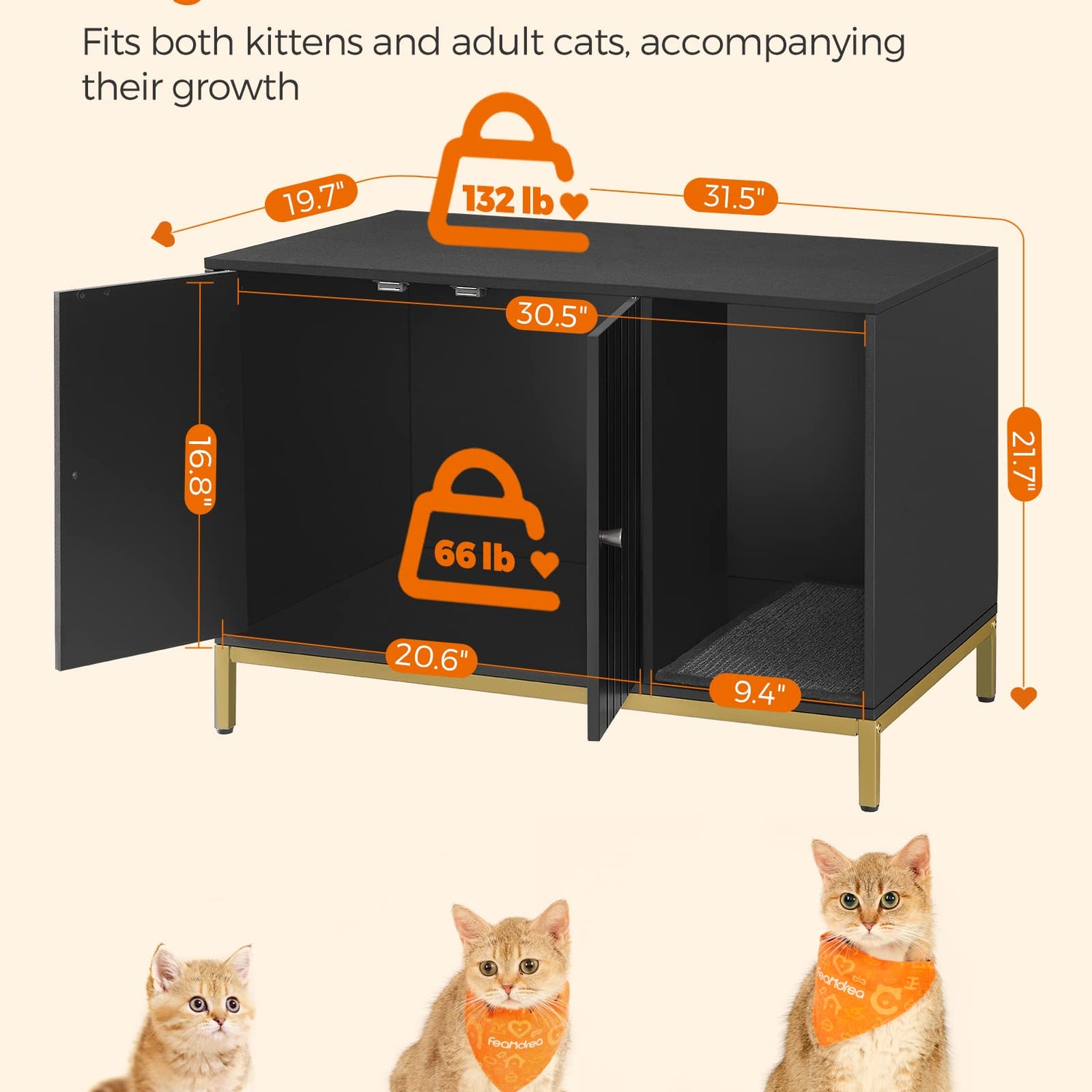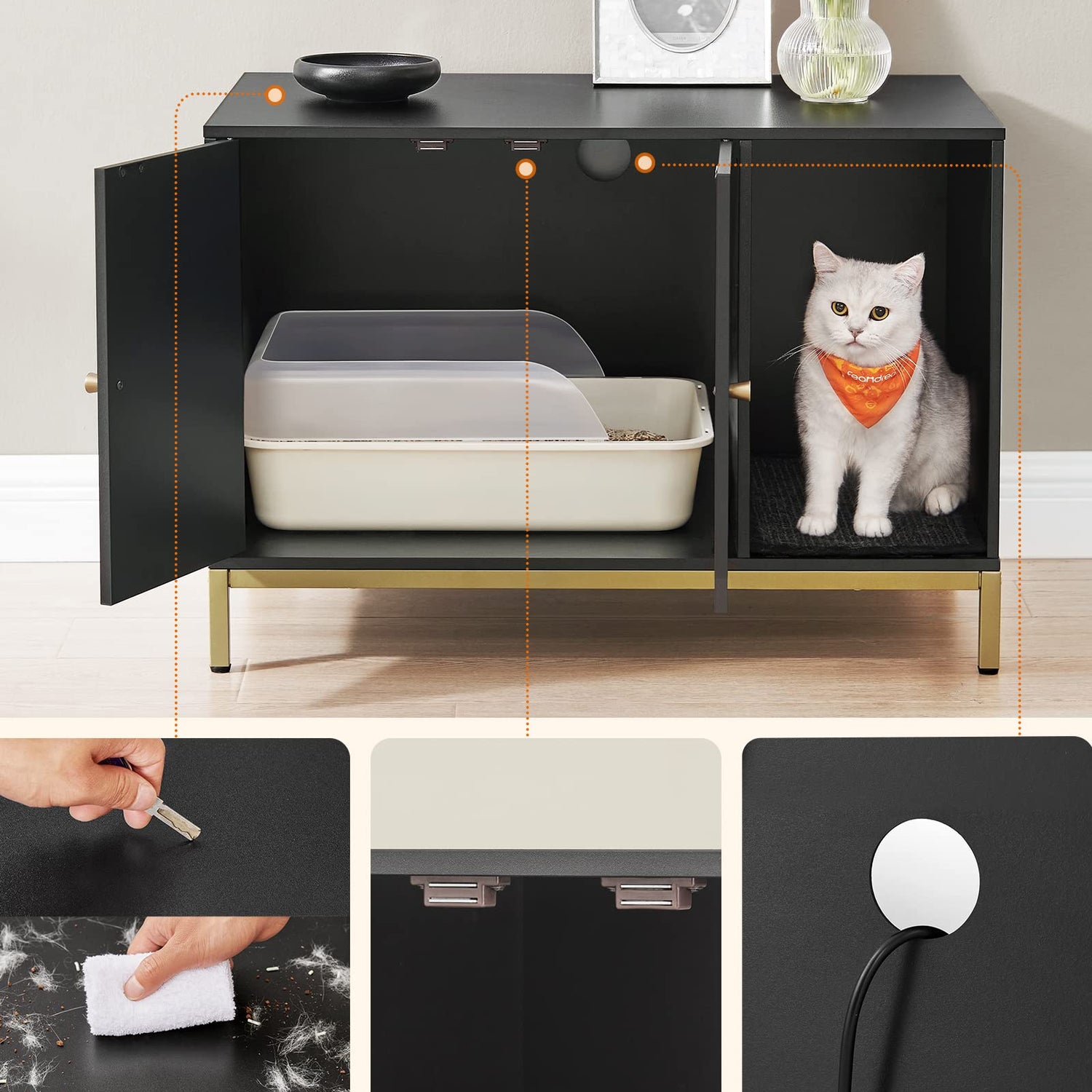 - [Style the Litter Box Area] Featuring a black finish and gold-colored metal frame, this modern litter box enclosure easily blends in with your current furniture, giving the once-messy litter box area a makeover
