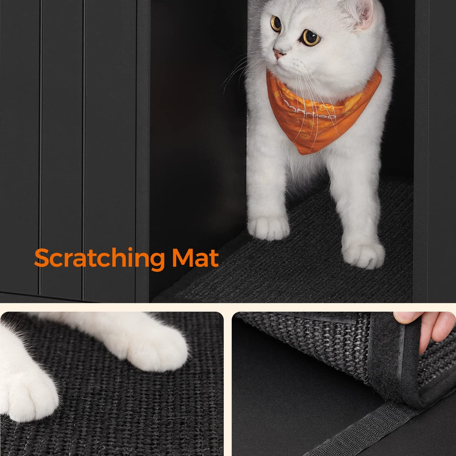 - [Satisfies Cats' Natural Instincts] The hidden litter box creates an enclosed space, giving your cat some privacy; the winding entry meets cats' natural love for exploring; a scratching mat in the entry lets your cat scratch while it traps stray litter