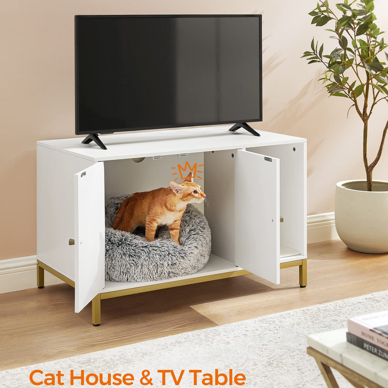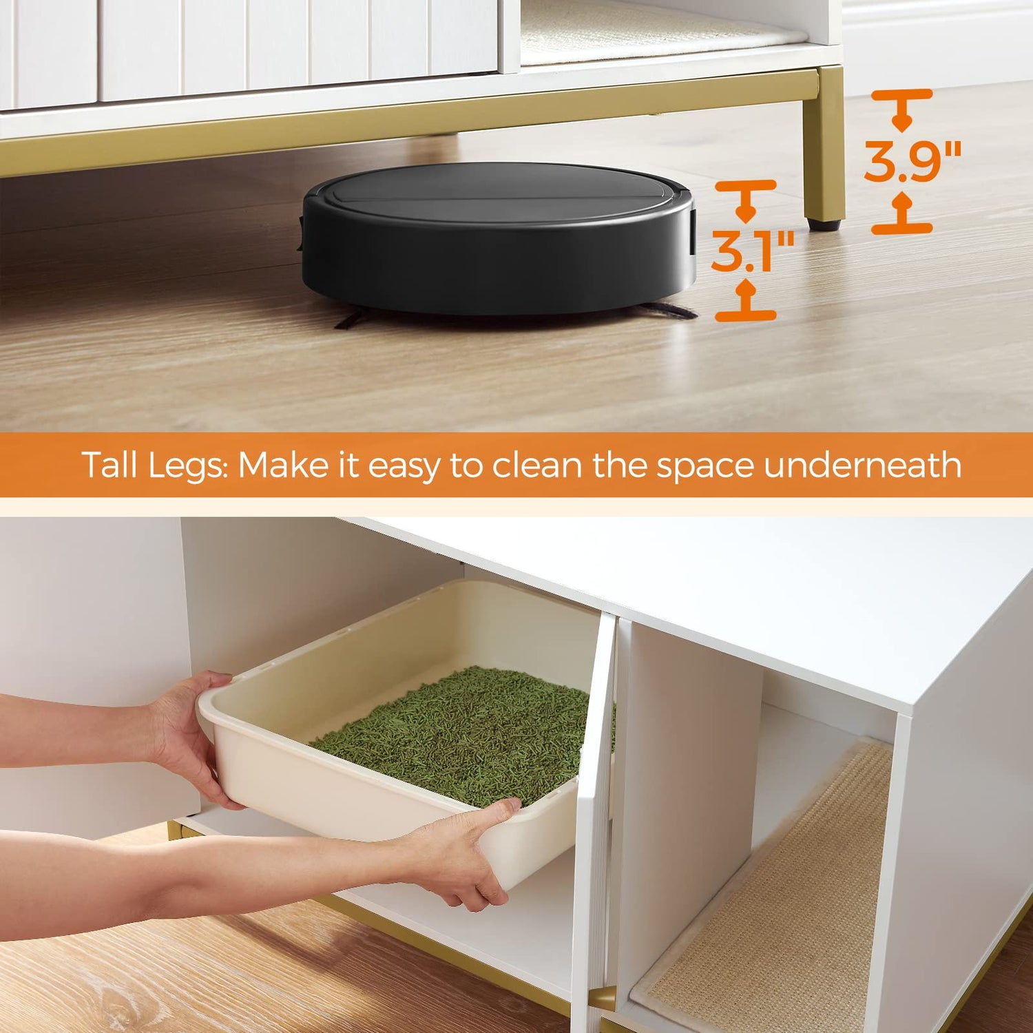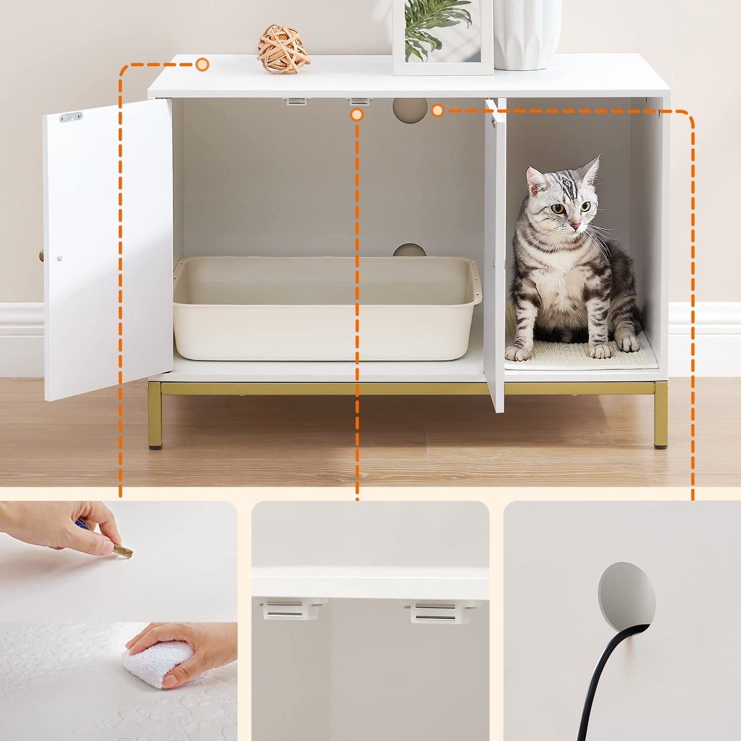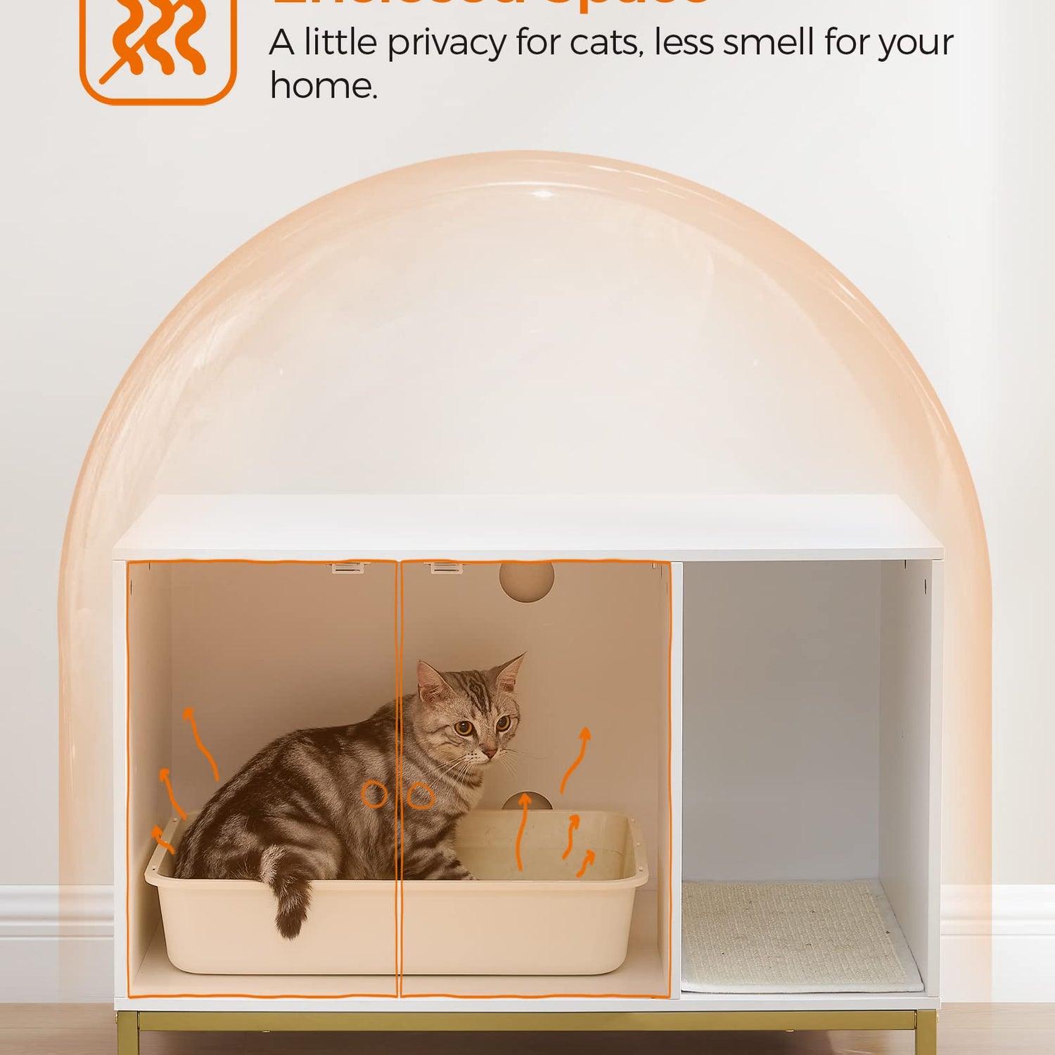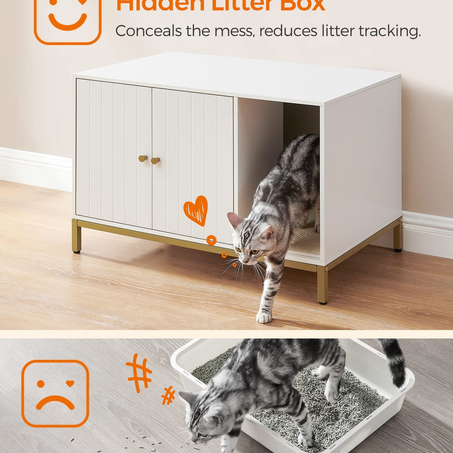 - [Style the Litter Box Area] Featuring a white finish and gold-colored metal frame, this modern litter box enclosure easily blends in with your current furniture, giving the once-messy litter box area a makeover