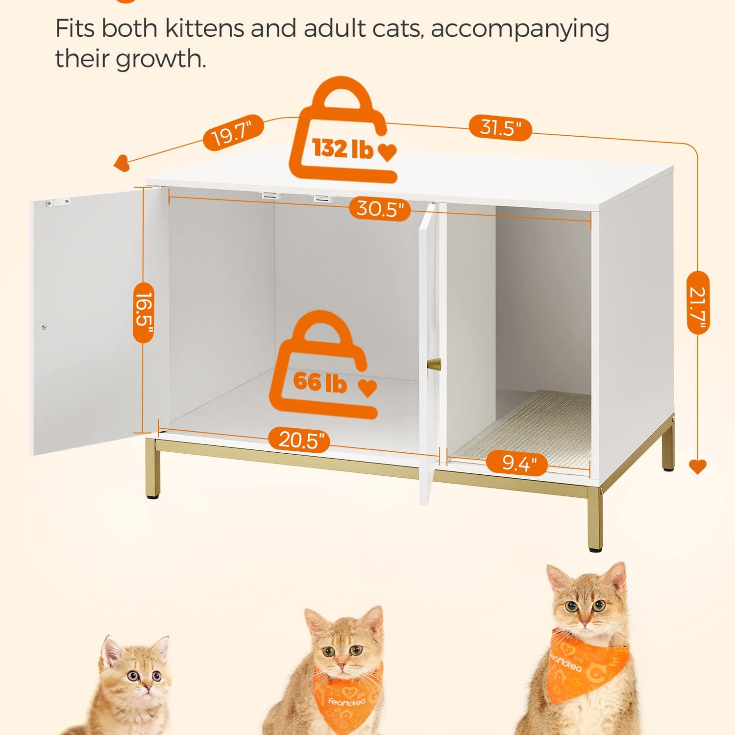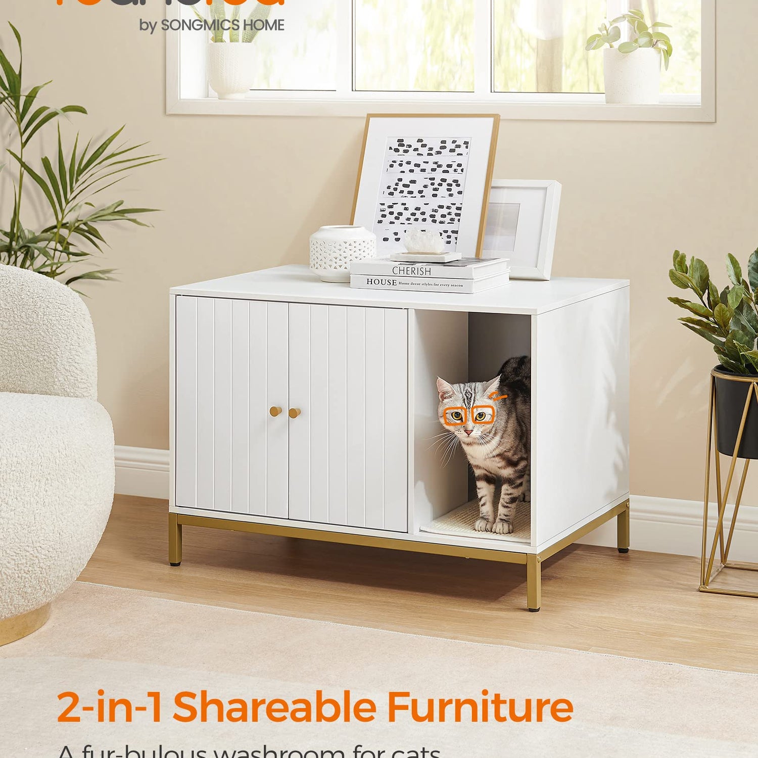 Feandrea Litter Box Enclosure, Modern Cat Litter Box Furniture Hidden, with Scratching Mat, Tall Legs, Cat House, Side End Table, 31.5 x 19.7 x 21.7 Inches, White and Gold UPCL007W01