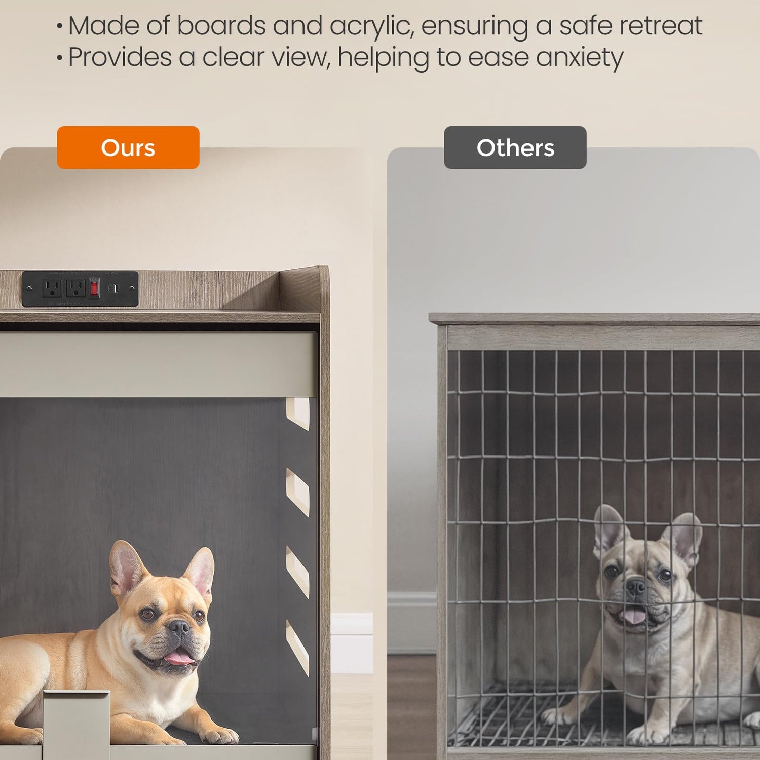 - 【BUILT-IN CHARGING STATION】Equipped with 2 AC outlets, 1 USB-A port, and 1 USB-C port, this dog kennel can charge up to 4 devices simultaneously, from your phone and tablet to your furry friend's electronic essentials like smart collar or electronic toys