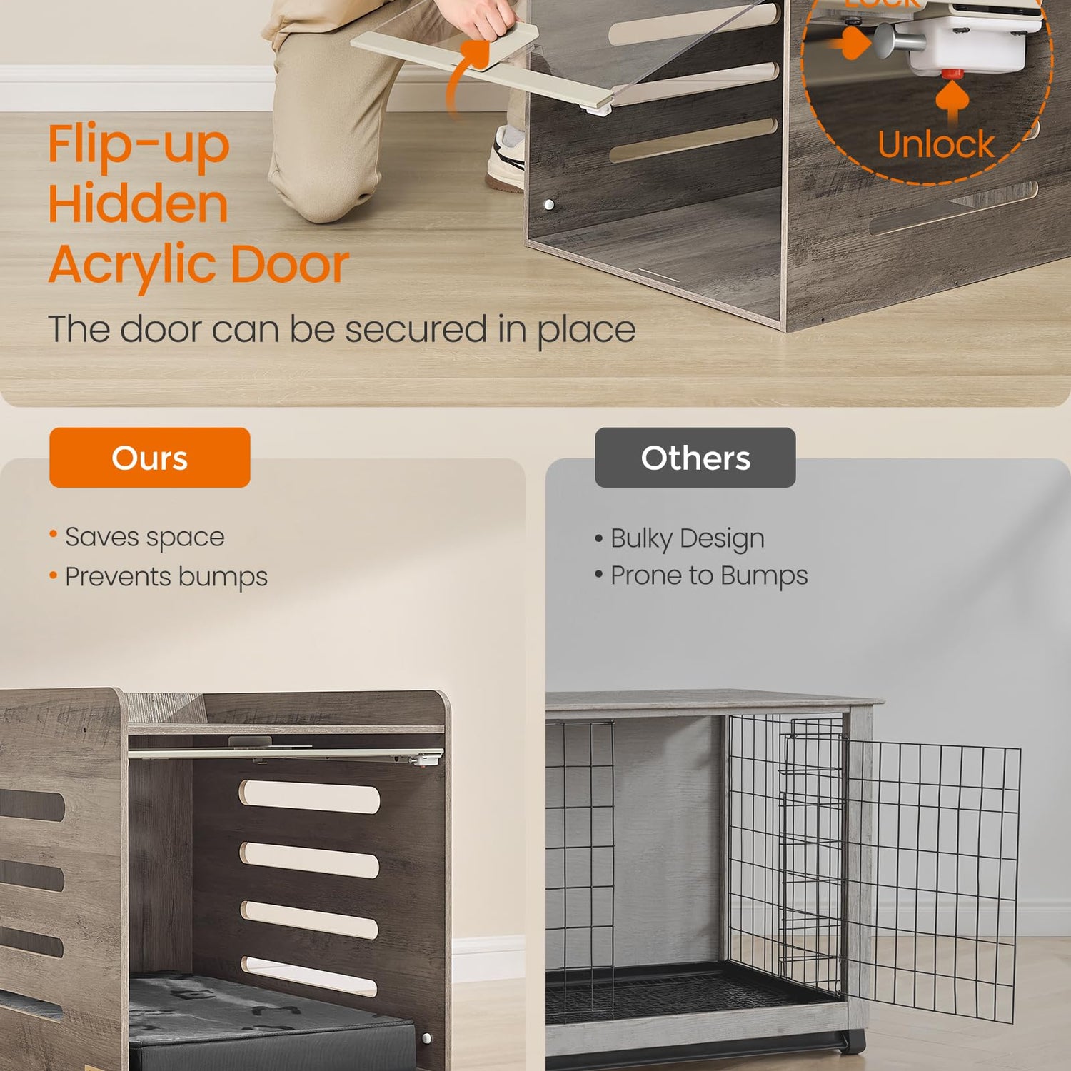- 【SPACE-SAVING FLIP-UP DOOR】The transparent acrylic door of the dog crate table features a flip-up design that tucks under the top, saving space and preventing bumps. When closed, it offers your pet a clear view of the surroundings, easing their anxiety