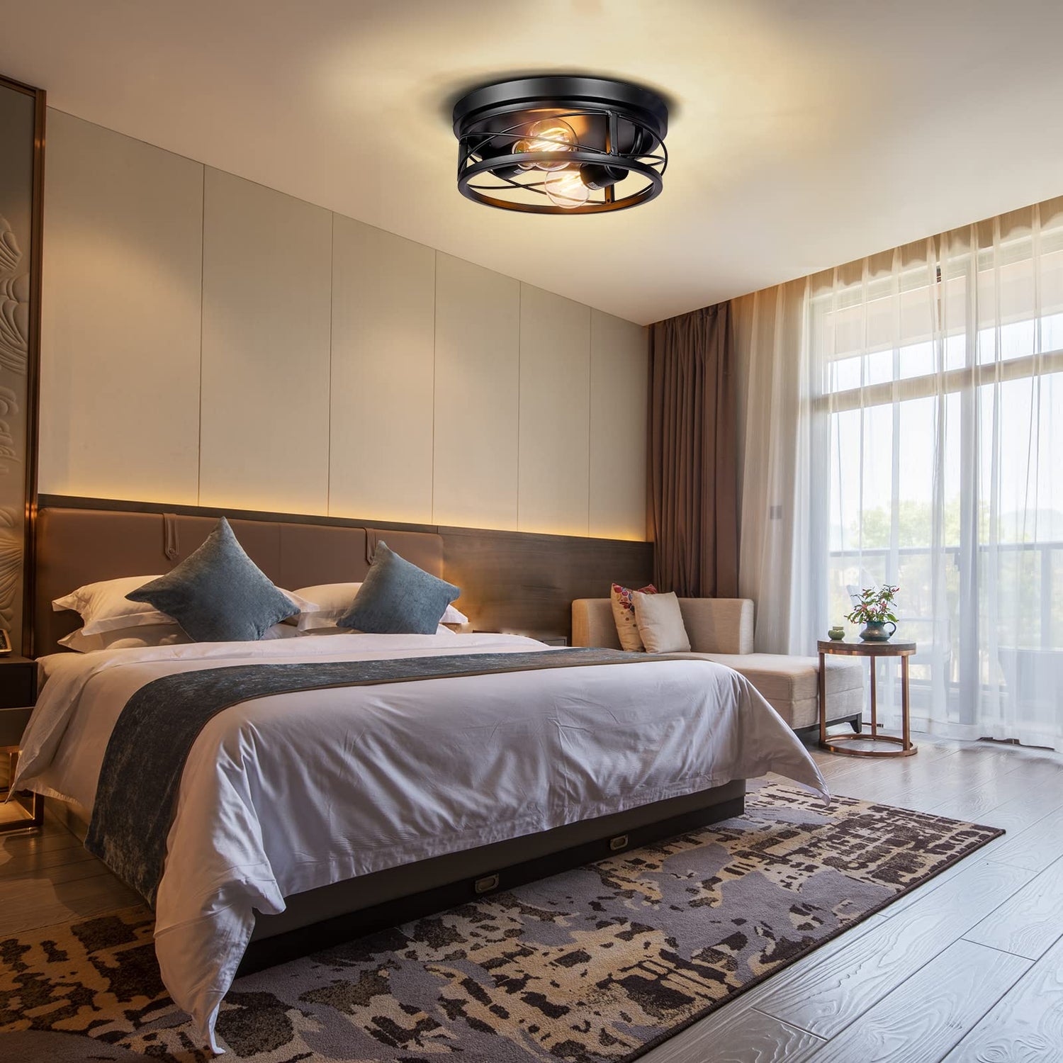 Feanron Farmhouse 2-Light Black Flush Mount Ceiling Light Fixtures, Industrial Vintage Metal Cage Closed to Ceiling Mount Lamp for Hallway Kitchen Bedroom 2 Pack, A19 LED Bulbs Included