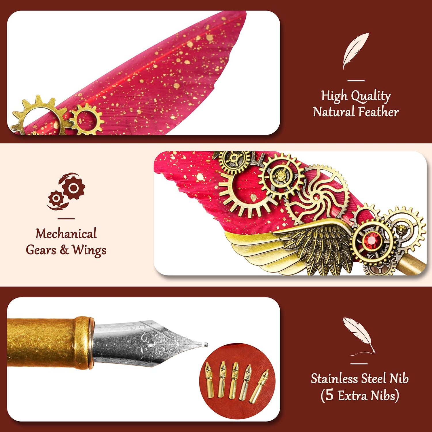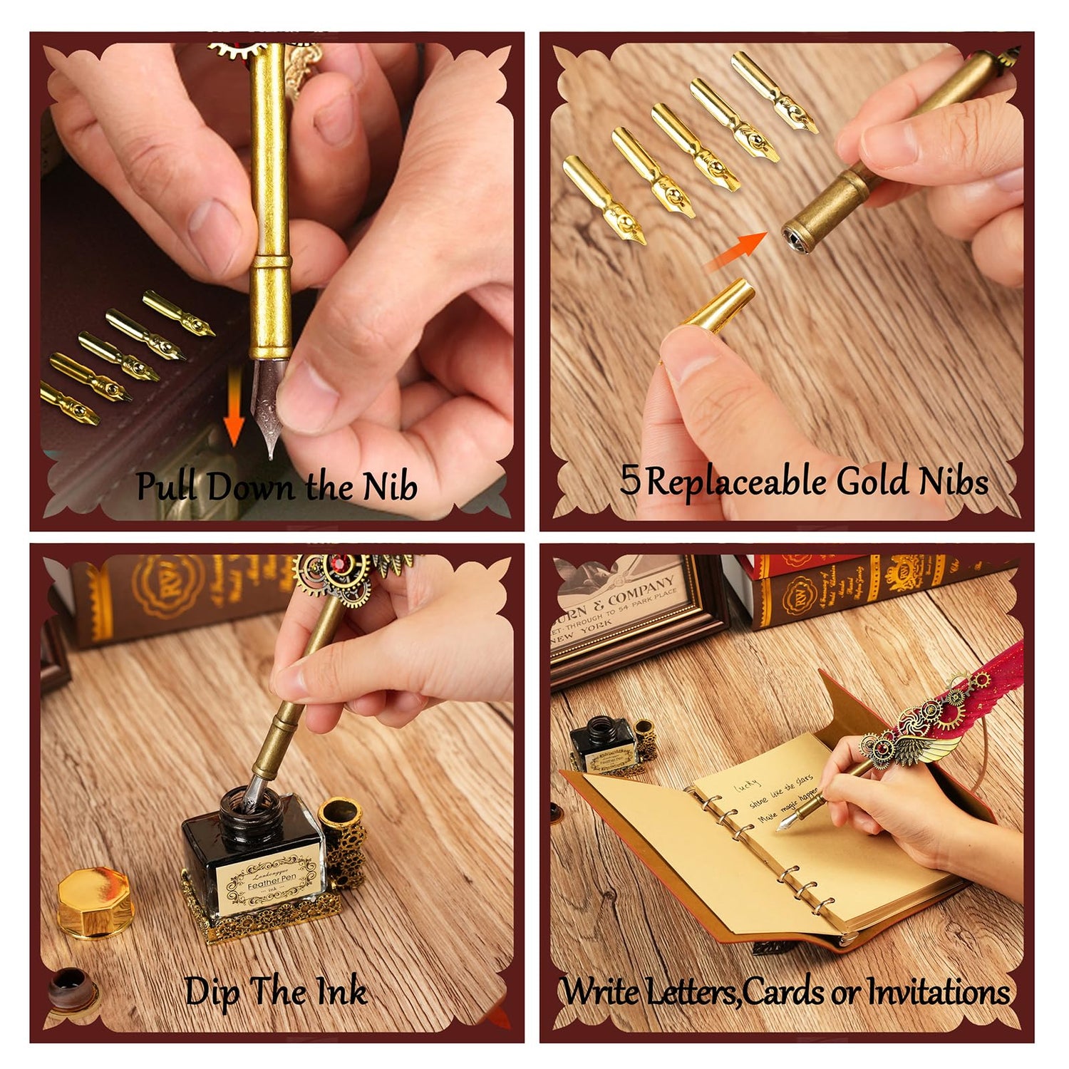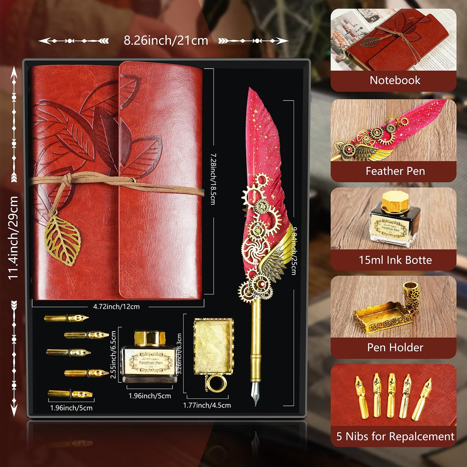 - Quill Pen and Ink Set:Includes 1*red feather pen,1*leather notebook,1*bottle of black Ink,1*pen holder,5*stainless steel replaceable nibs,the vintage calligraphy pen set has everything you need.