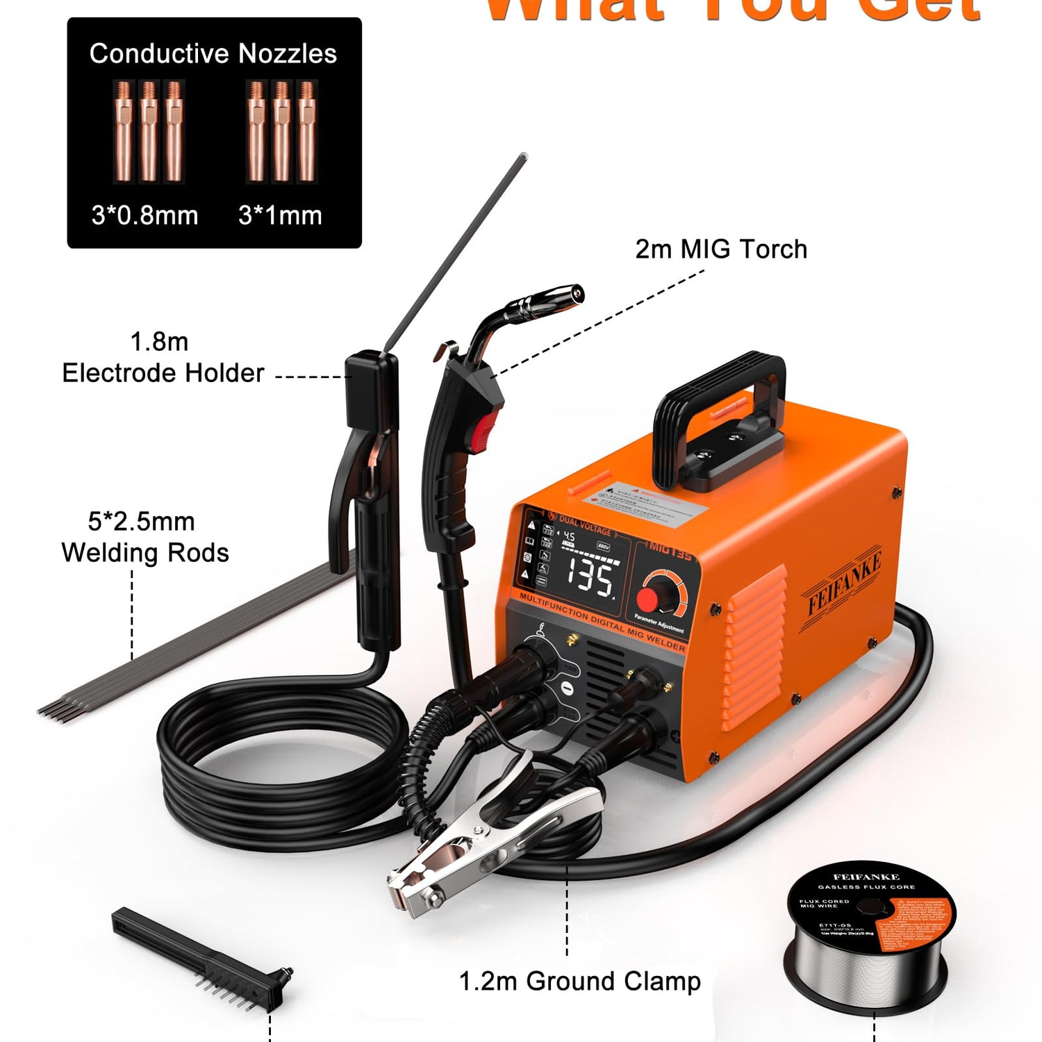- 【Easy to Work with Full Welding Kit】Portable flux core mig welder weighs only 14.5 pounds. Package includes: 1*135 MIG Welding Machine, 1*MIG Torch, 1*Ground Clamp, 1*Electrode Holder, 5*3/32'' welding rods, 1*1 LB 0.8 mm flux fore wire, 3*0.8 mm Conductivity Nozzles, 3*1.0 mm Conductivity Nozzles, 1*Brush, 1*User Manual.