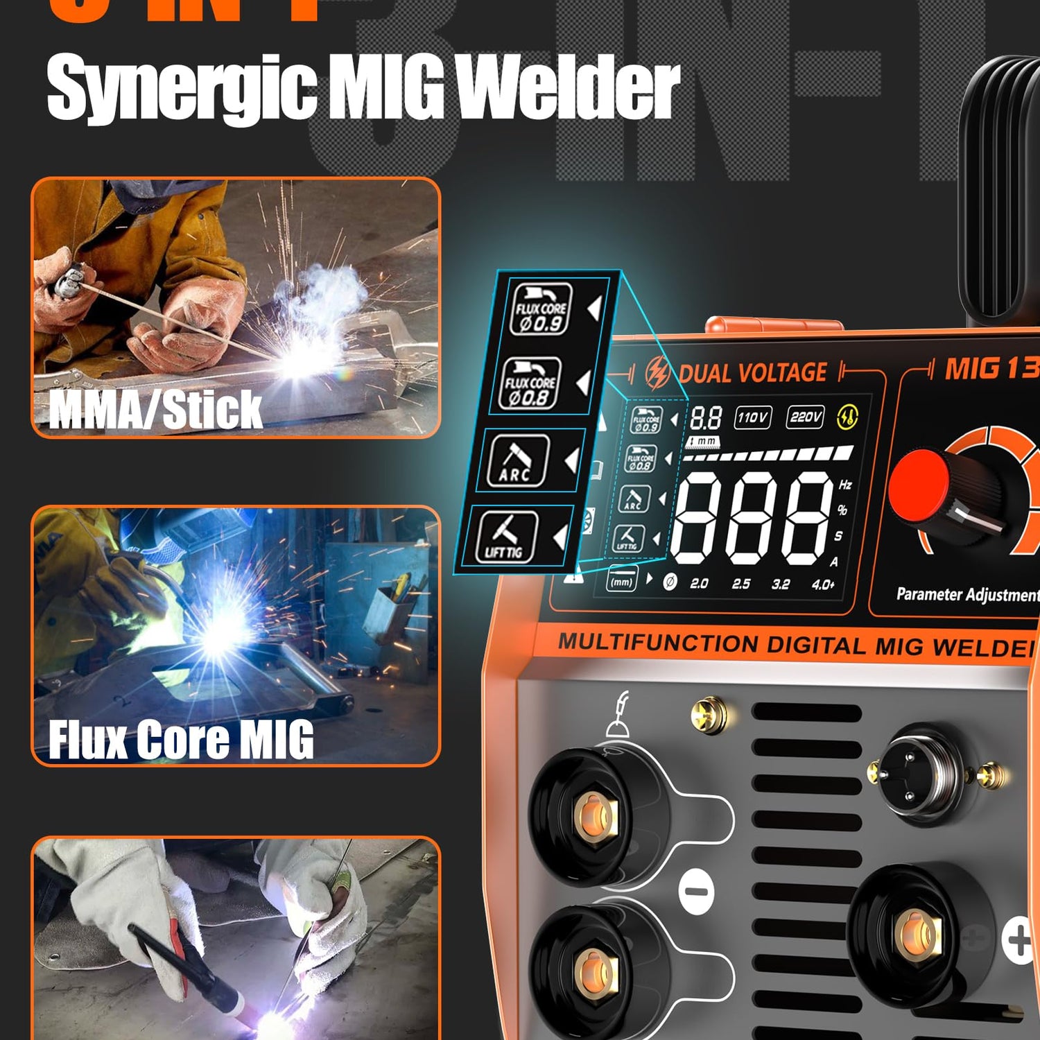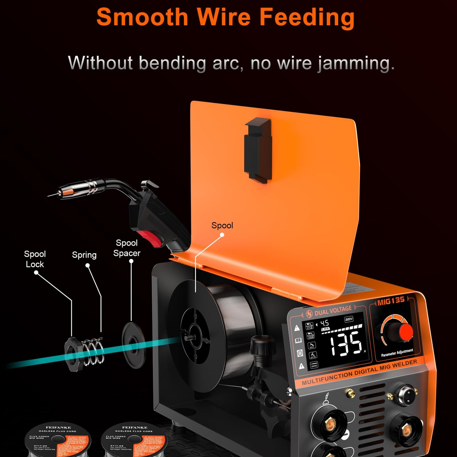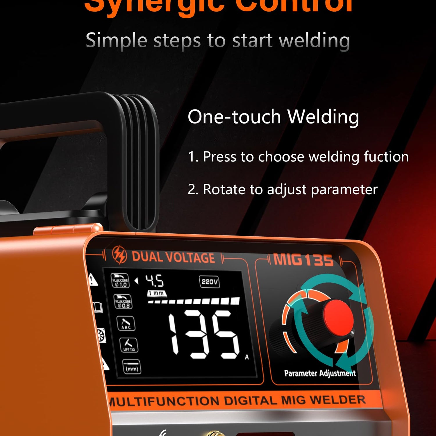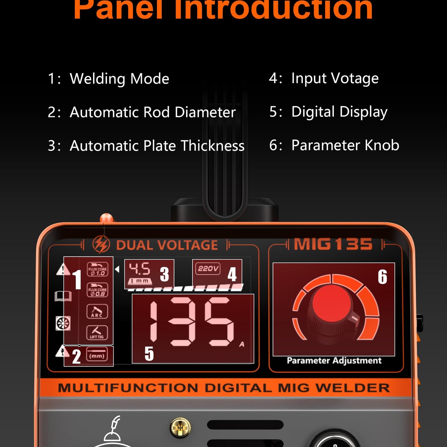 - 【Synergic MIG Welder】FEIFANKE 135A 110V MIG welder will match the voltage intelligently. After selecting the wire diameter, you can control the wire feeding speed by adjusting the current (30-135A), and the flux core welder will recommend the suitable plate thickness. Large digital panel is clear and easy to operate for both beginners and professional welders.