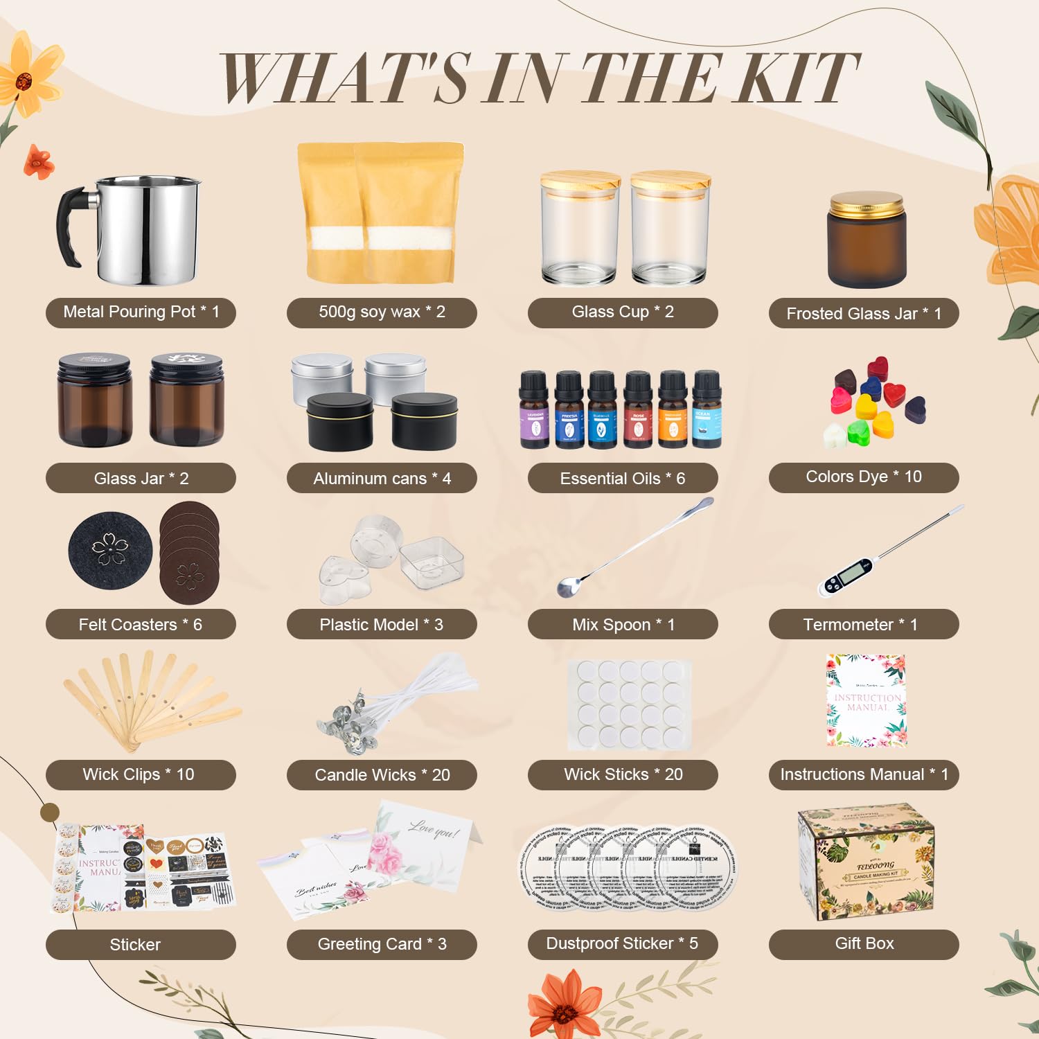 - COMPLETE CANDLE MAKING KIT: 1 kg soy wax (60 g ≈ 1 tin candle), 6 x essential oils, 1 x 1300ml metal pot, 20 x candle wicks, 20 x wick stickers, 10 x color dyes, 4 x candle tins, 5 x glass jars, 3 x plastic molds, 5 x wooden centering device, 1 x stirring spoon, 6 x heat insulation pads, several DIY stickers, 1 x instruction manual, 3 x blessing cards, 5 x dustproof paper, and more