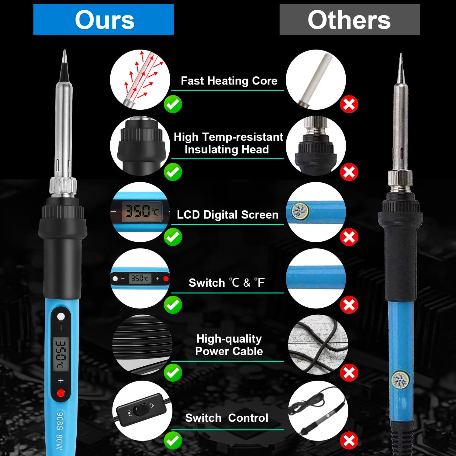 - [Fast Heat-up Technology]: Experience lightning-fast heat-up times with our premium ceramic core soldering iron. It reaches operating temperatures in just 15 seconds, allowing you to start soldering without any delay. The 110-220Volt soldering iron features a clear LCD display and allows you to accurately adjust the temperature between 180℃-480℃/ 356°F-896°F. Switch effortlessly between Celsius and Fahrenheit for convenience.