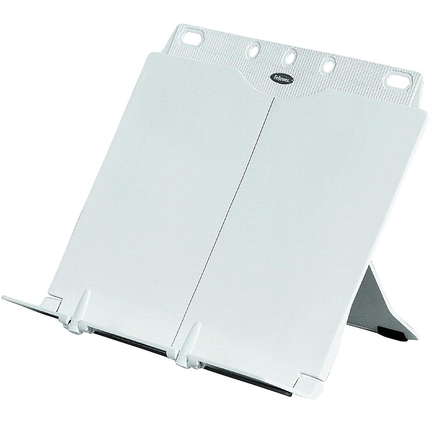 The 21100 is a convenient copyholder from Fellowes, designed especially for use with large textbooks and manuals. The two adjustable clips hold in place pages from even the largest, thickest textbooks, while the entire copyholder folds flat and fits neatly into a letter size ring binder. Convenient for holding often used reference or technical manuals and daily planners, the 21100 features nine height adjustments, accommodating virtually all sizes of books.