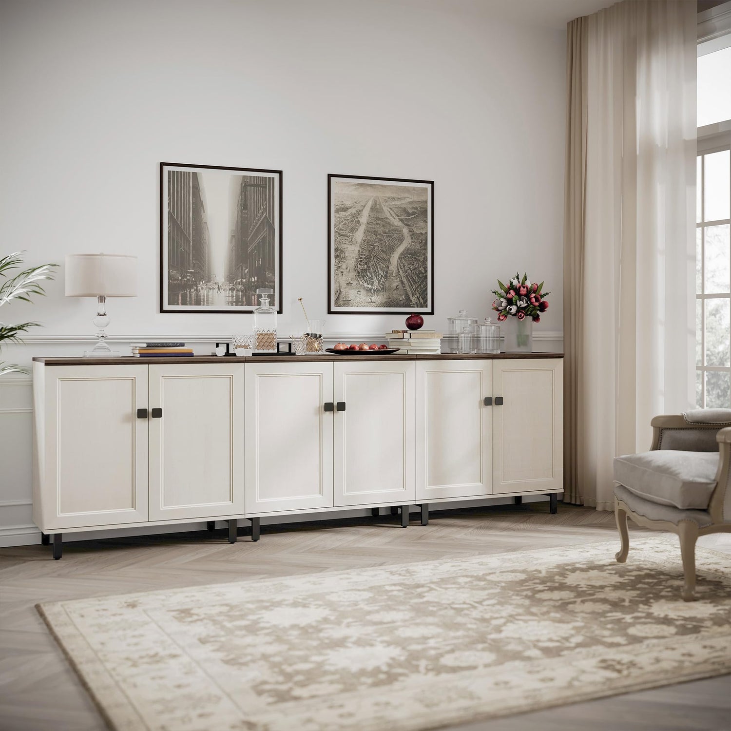 - Convenient & Versatile Design: The farmhouse buffet sideboard with a distressed surface is a classic and elegant piece that seamlessly complements any interior design. Its versatility makes it an excellent choice for a variety of uses, such as a storage cabinet in the living room, a hallway console, or even an office credenza. This adaptable furniture piece can be placed in the dinning room, hallway, living room or office to add both style and functionality. Overall Dimensions: 94.2"(L)x15.7"(W)x31.4"(H).