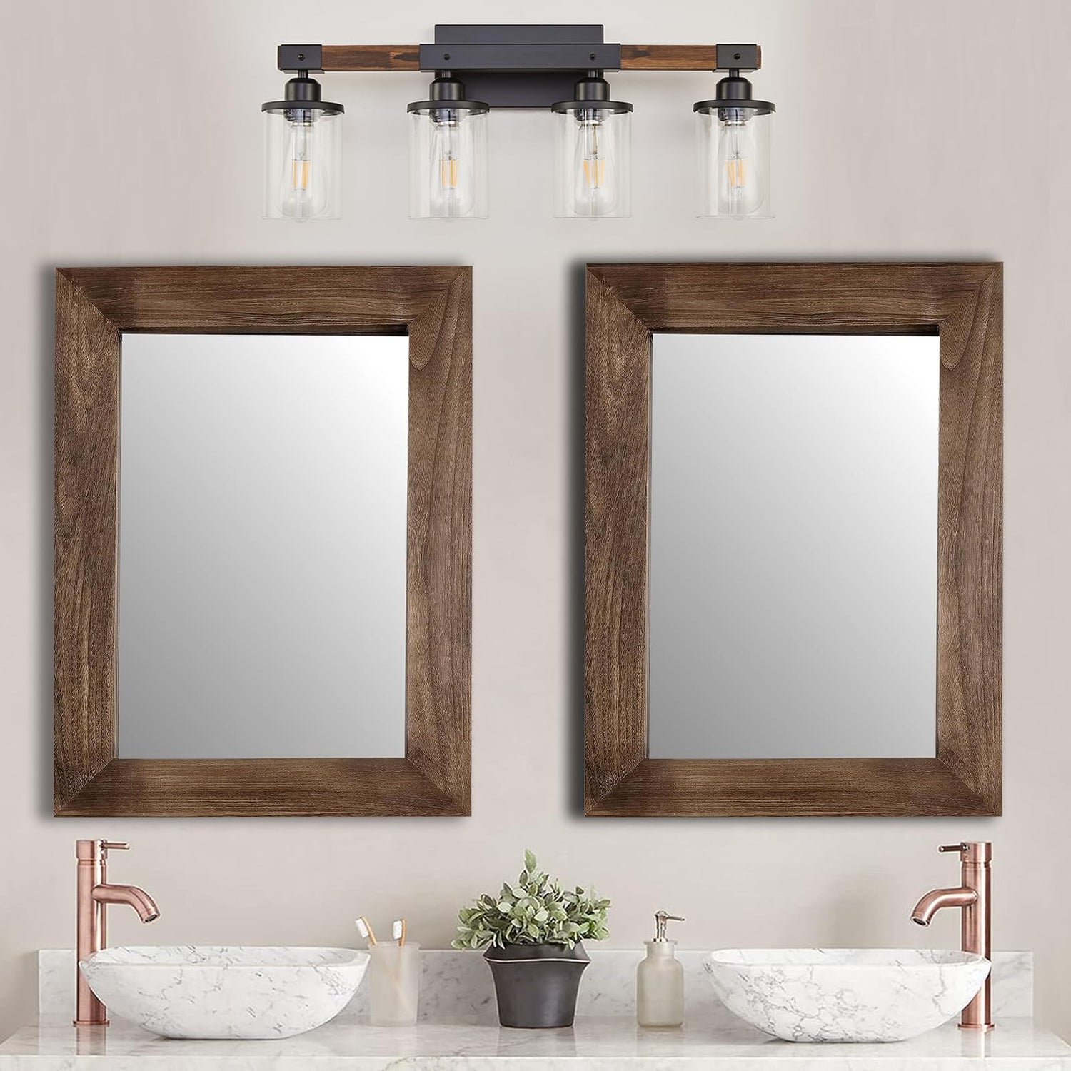 - Farmhouse Bathroom Light Fixtures: This 4-Light rustic bathroom light fixtures features real wood and clear glass for a strong rustic farmhouse vibe. Its sturdy yet stylish design makes it the ideal choice to brighten up your bathroom.
