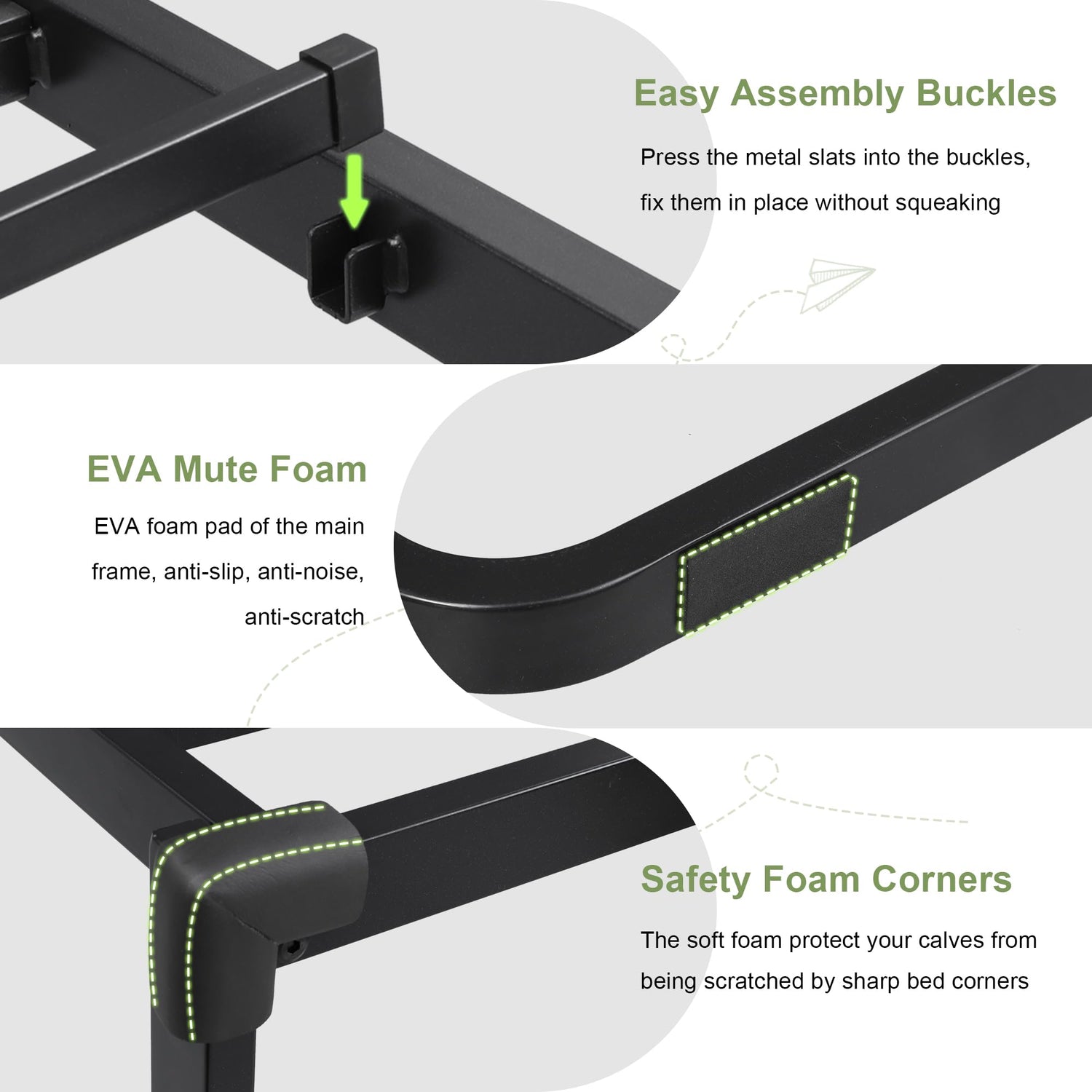 - No Noise & Easy Assembly: EVA strips isolate perfectly all noise. Slats one-click buckles install only takes 20 minutes to finish assembling (NOTE: MATTRESS NOT INCLUDED)