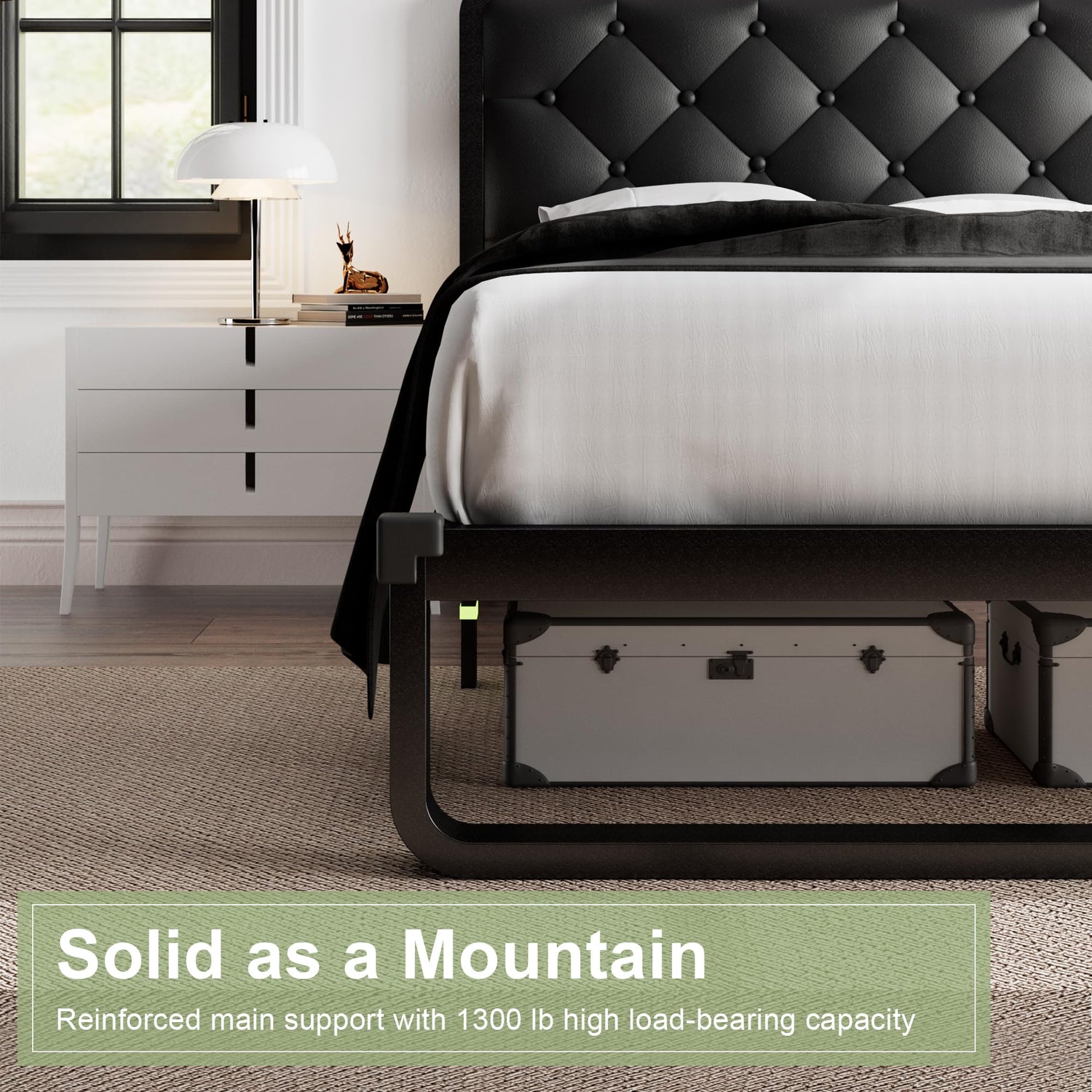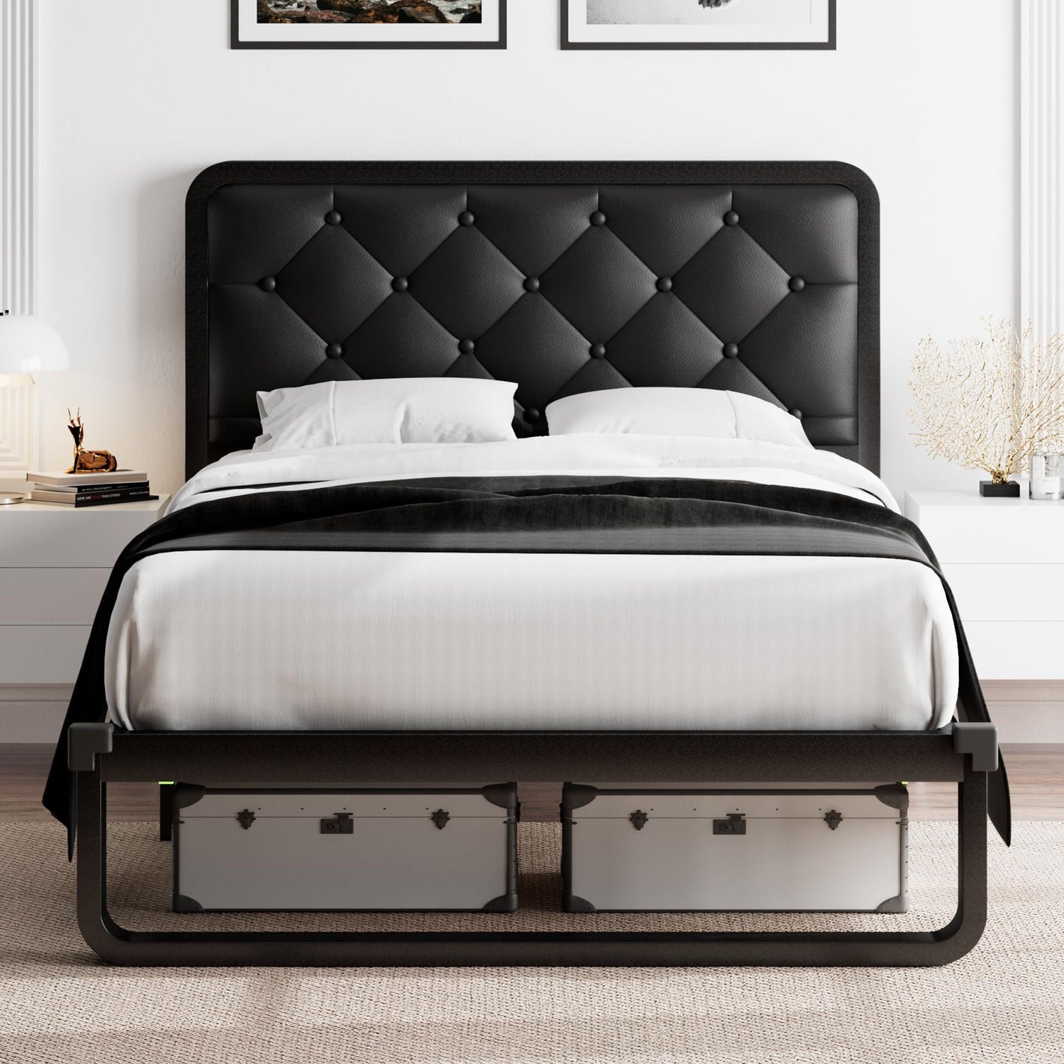 - Minimalist Aesthetics: A combination of lacquered metal frame and classic faux leather diamond tufted headboard can be paired with any furniture decor style for a personalized look. Soft touch provides comfort and support when lying in bed