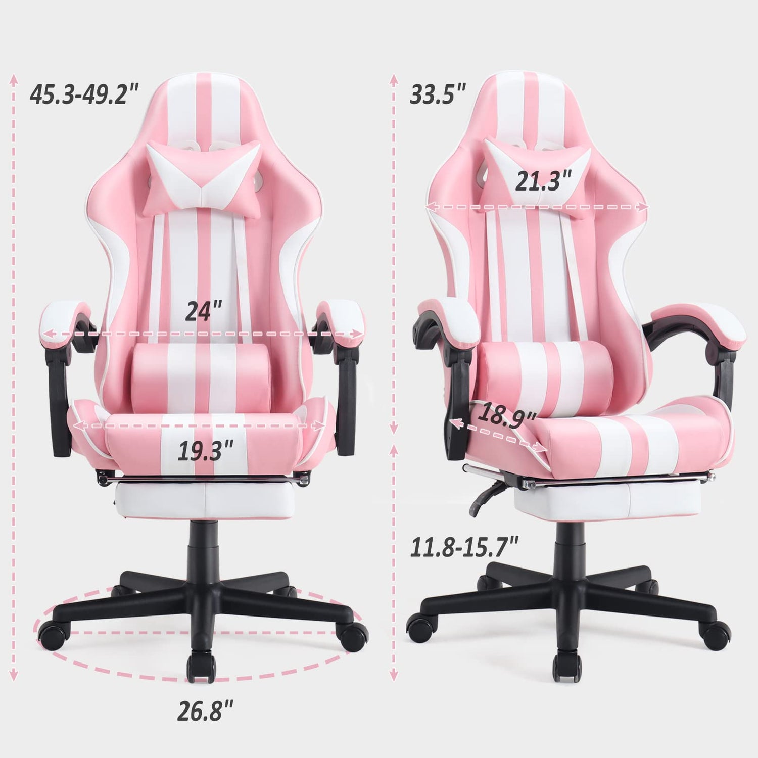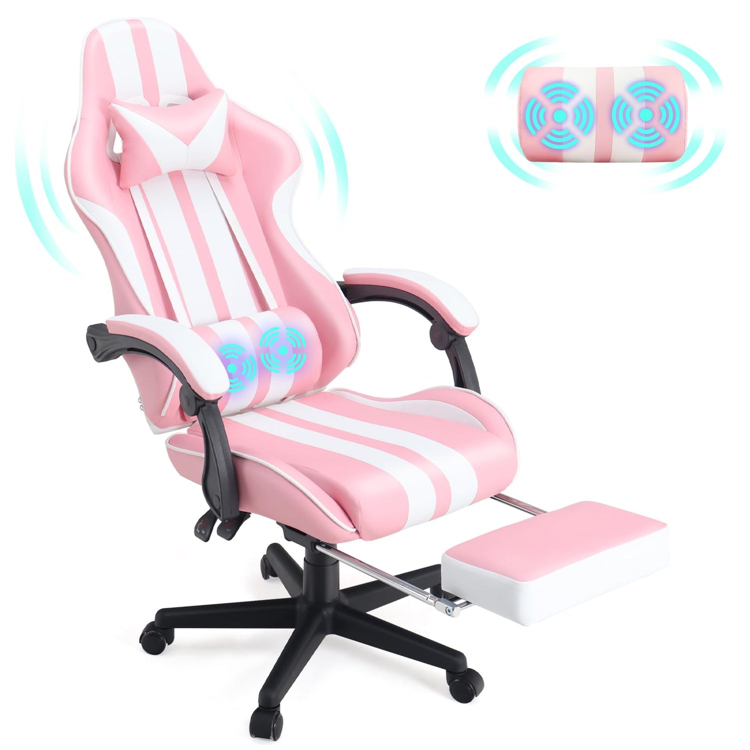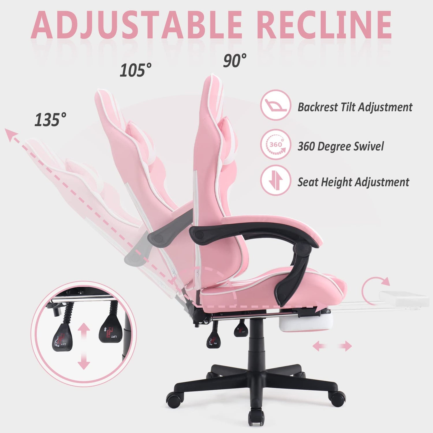 - [Versatile Functionality]-This Pink computer gaming chair is not just for racing but also an enhanced PC gaming chair. It features a reclining backrest adjustable from 90° to 135°, a 360° swivel mechanism, 100mm seat height adjustment, a retractable footrest, a removable and adjustable headrest pillow, and a USB massage lumbar cushion for added support.