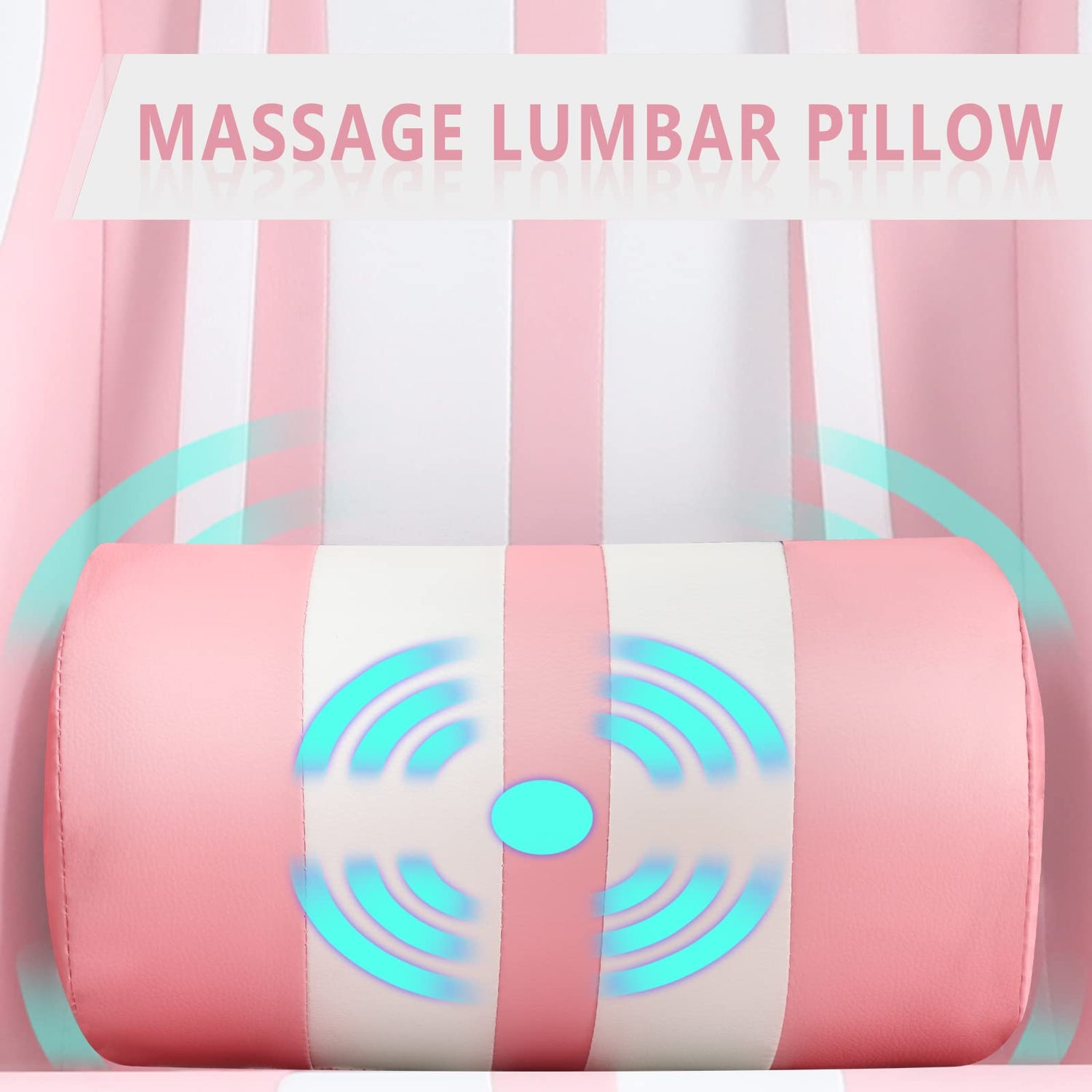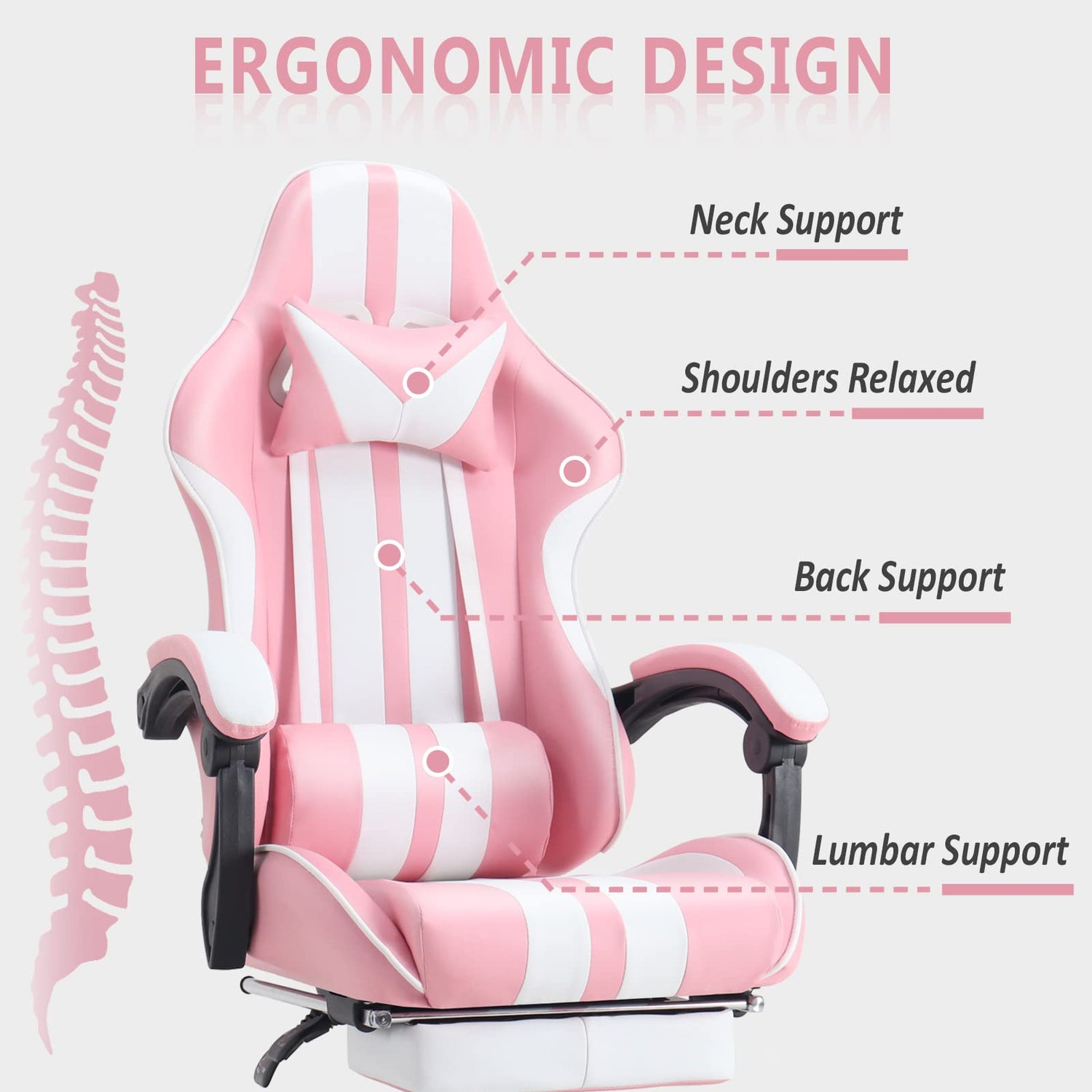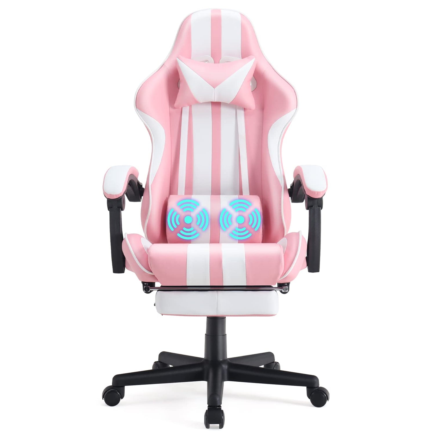- [Versatile Functionality]-This Pink computer gaming chair is not just for racing but also an enhanced PC gaming chair. It features a reclining backrest adjustable from 90° to 135°, a 360° swivel mechanism, 100mm seat height adjustment, a retractable footrest, a removable and adjustable headrest pillow, and a USB massage lumbar cushion for added support.