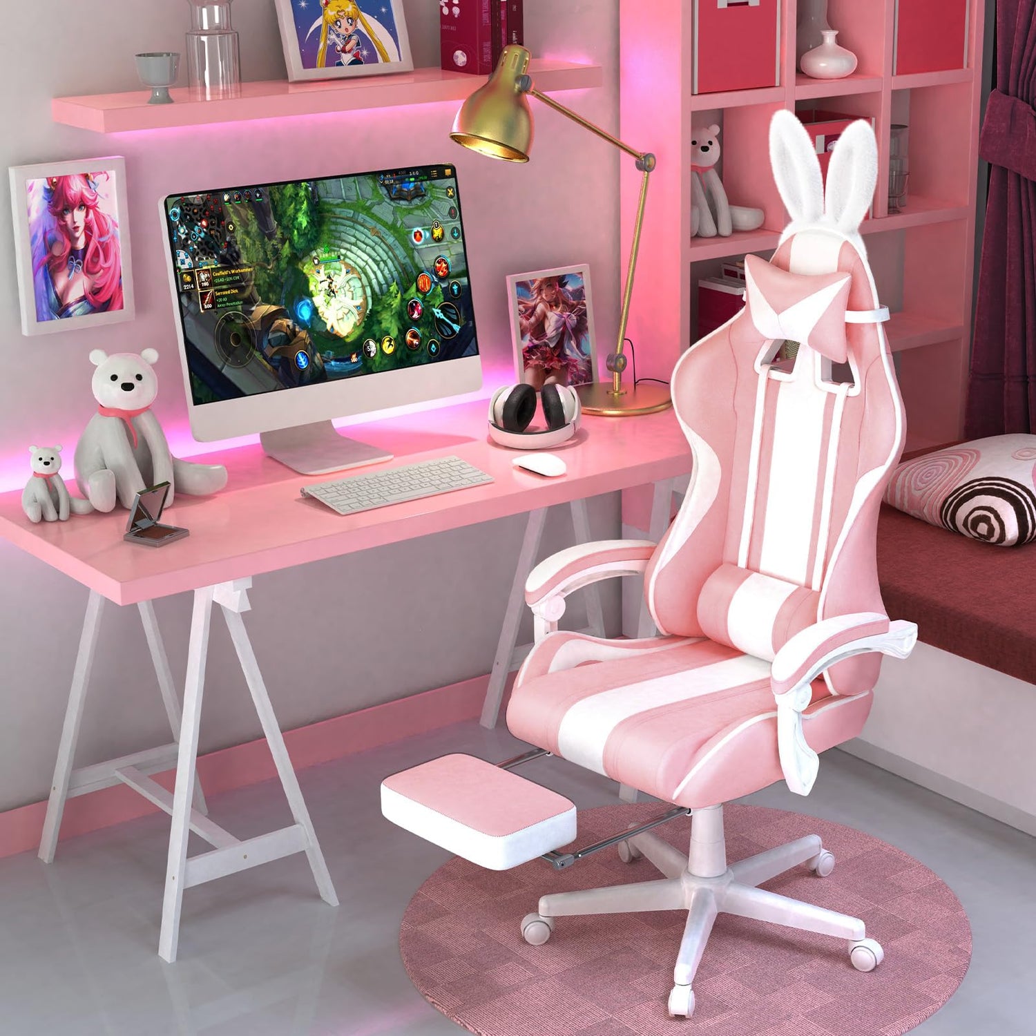 Ferghana Kawaii Pink Gaming Chair with Bunny Ears, Ergonomic Cute Gamer Chair with Footrest and Massage, Racing Reclining Leather Office Computer Game Chair 250lbs for Girls Adults Teens Kids