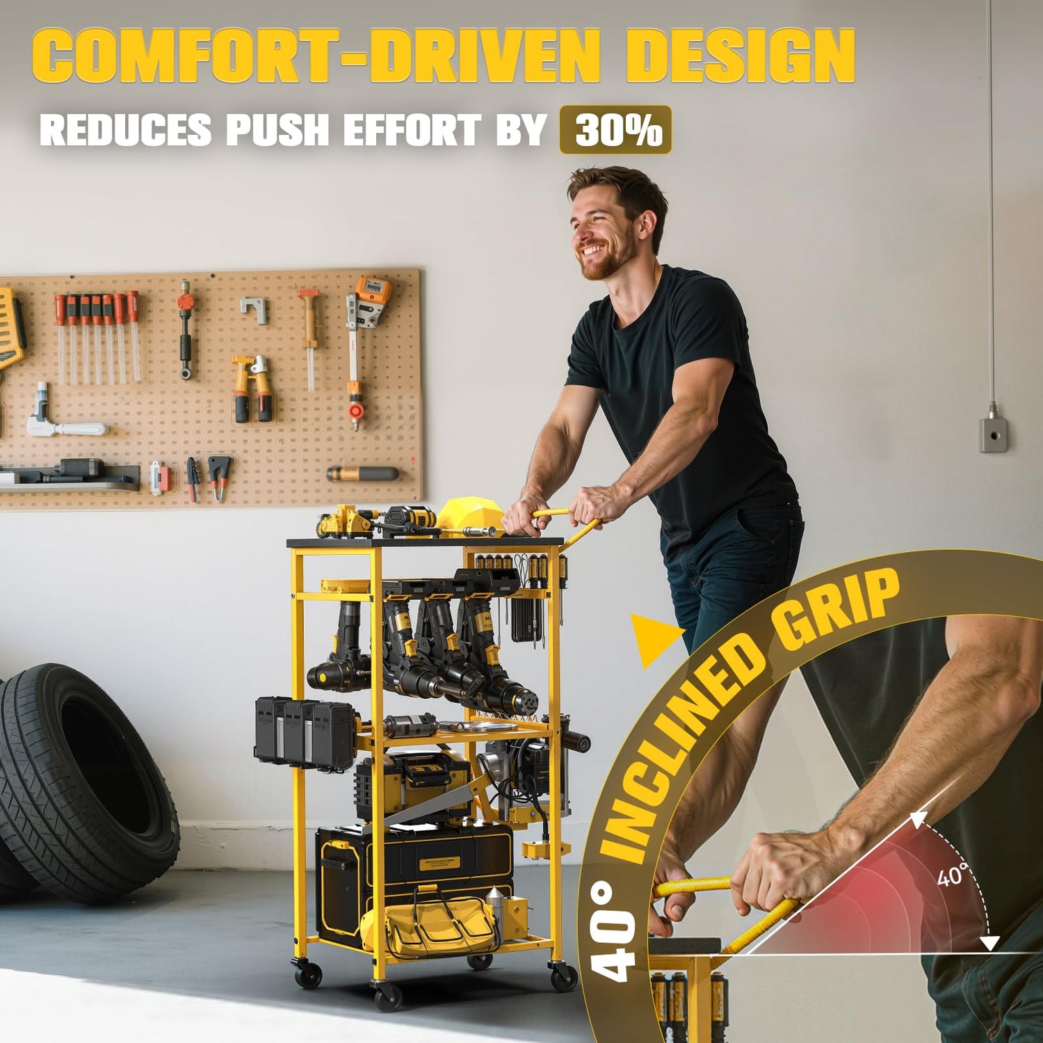 - Pro-Grade Ergonomic Armrest: The 40° inclined grip armrest reduces pushing effort by 30%, making it easier to move this power tool organizer cart even when fully loaded. This design provides a more comfortable and effortless operation, enhancing the overall usability and comfort of your shed storage organization system
